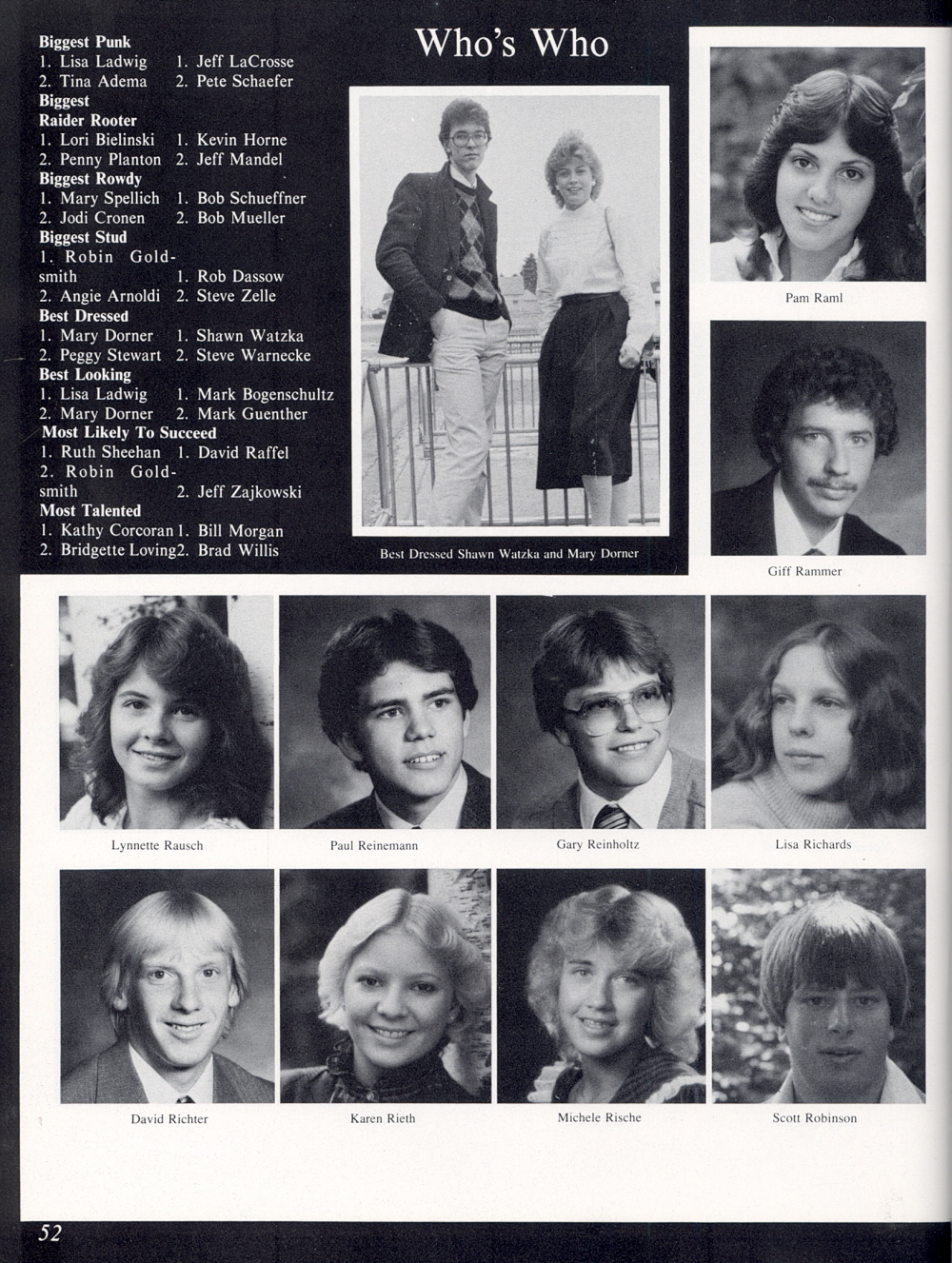 1983 Sheboygan North High School, Page 52: Pam Raml, Giff Rammer, Lynnette Rausch, Paul Reinemann, Gary Reinholtz, Lisa Richards, David Richter, Karen Rieth, Michele Rische, Scott Robinson.