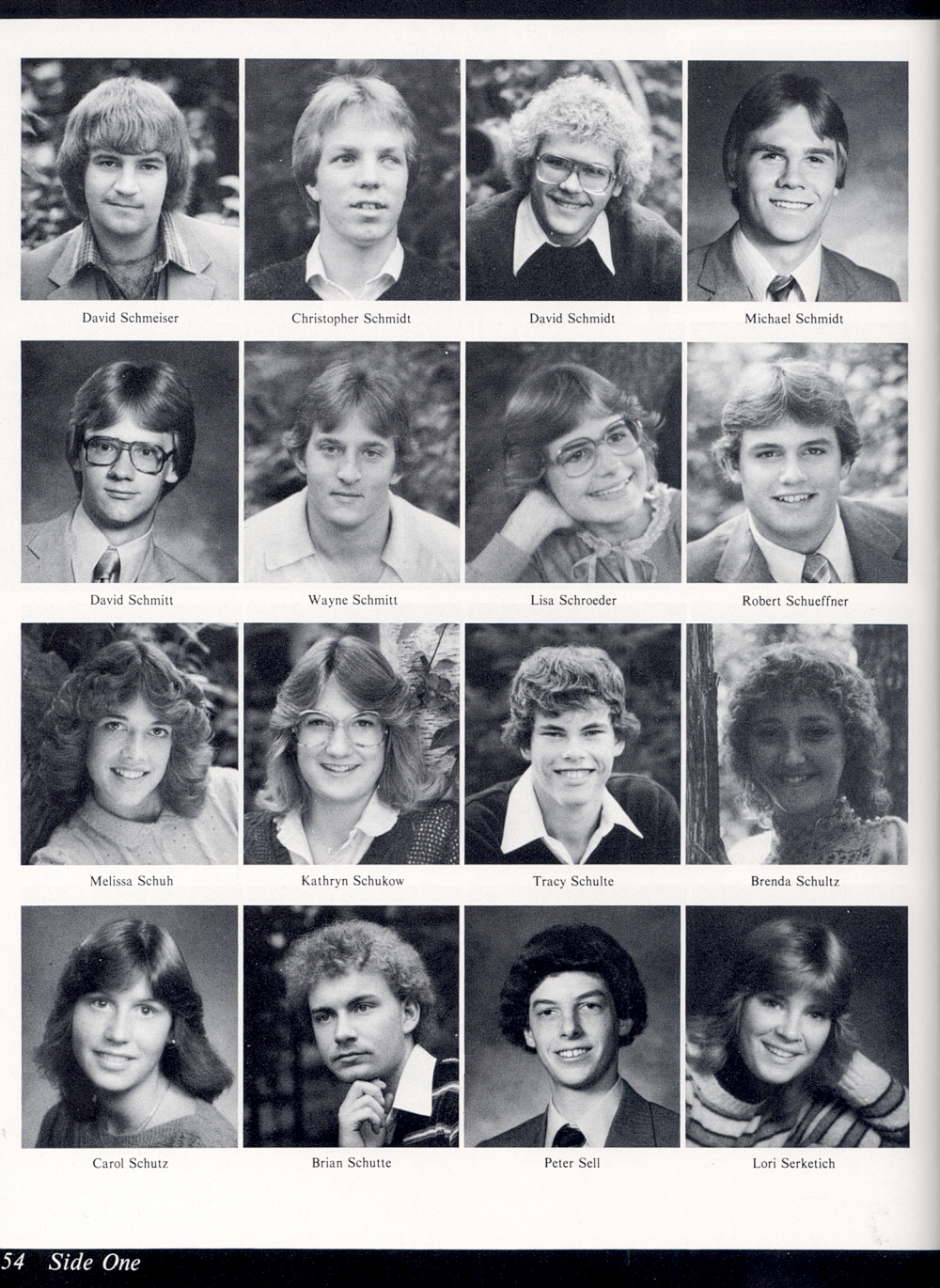 High School, Page 54: David Schmeiser, Christopher Schmidt, David Schmidt, Michael Schmidt, David Schmitt, Wayne Schmitt, Lisa Schroeder, Robert Schueffner, Melissa Schuh, Kathryn Schukow, Tracy Schulte, Brenda Schultz, Carol Schultz, Brian Schutte, Peter Sell, Lori Serketich.