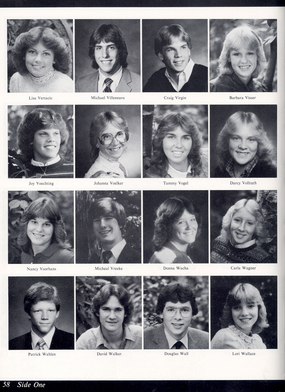 High School, Page 58: Lisa Vertacic, Michael Villeneuve, Craig Virgin, Barbara Visser, Joy Voechting, Johanna Voelker, Tammy Vogel, Darcy Vollrath, Nancy Voorhans, Michael Vreeke, Donna Wacha, Carla Wagner, Patrick Wahlen, David Walker, Douglas Wall, Lori Wallace.