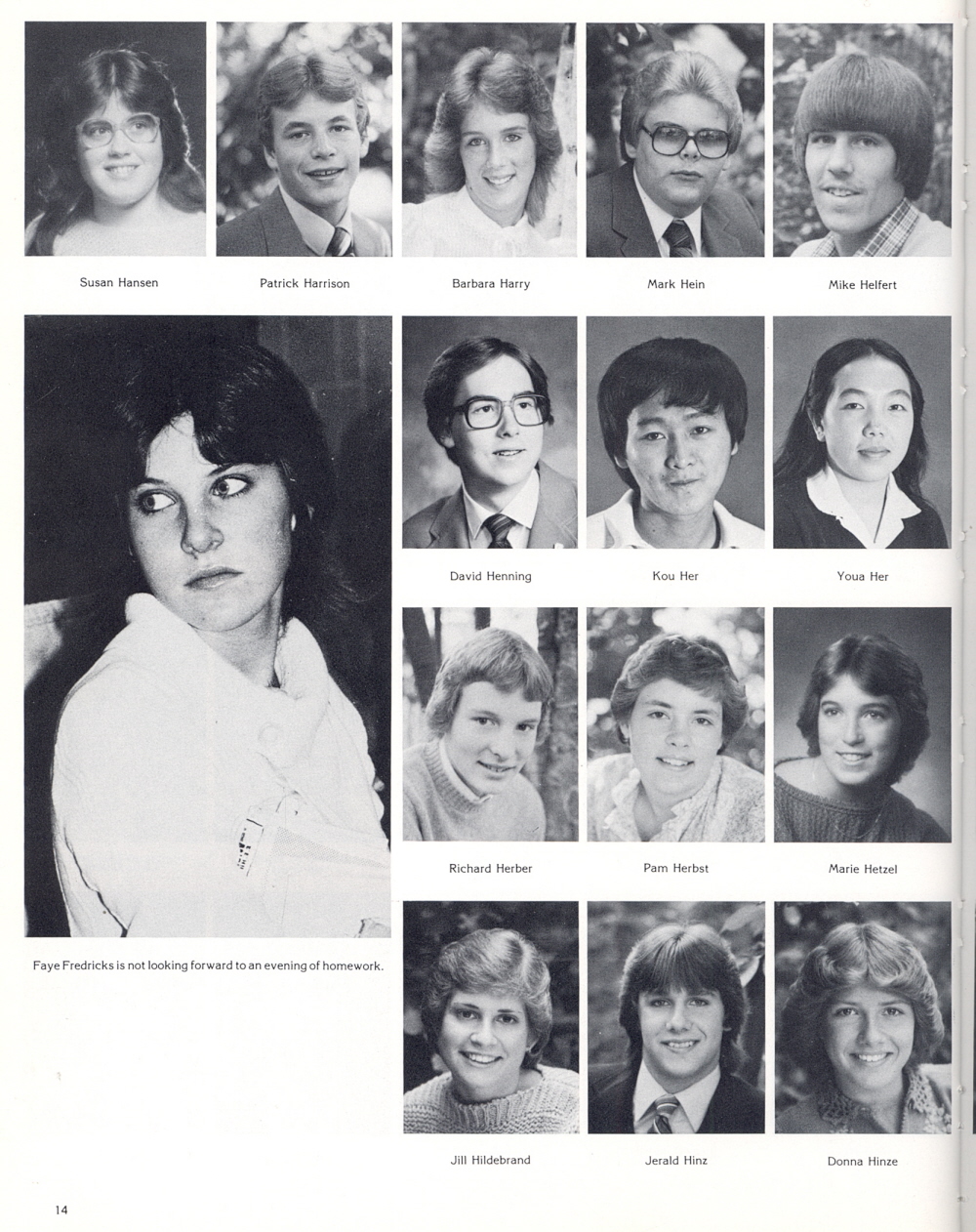 1983 Sheboygan South High School, Page 14: Susan Hansen, Patrick Harrison, Barbara Harry, Mark Hein, Mike Helfert, David Henning, Kou Her, Youa Her, Richard Herber, Pam Herbst, Marie Hetzel, Jill Hildebrand, Jerald Hinz, Donna Hinze.