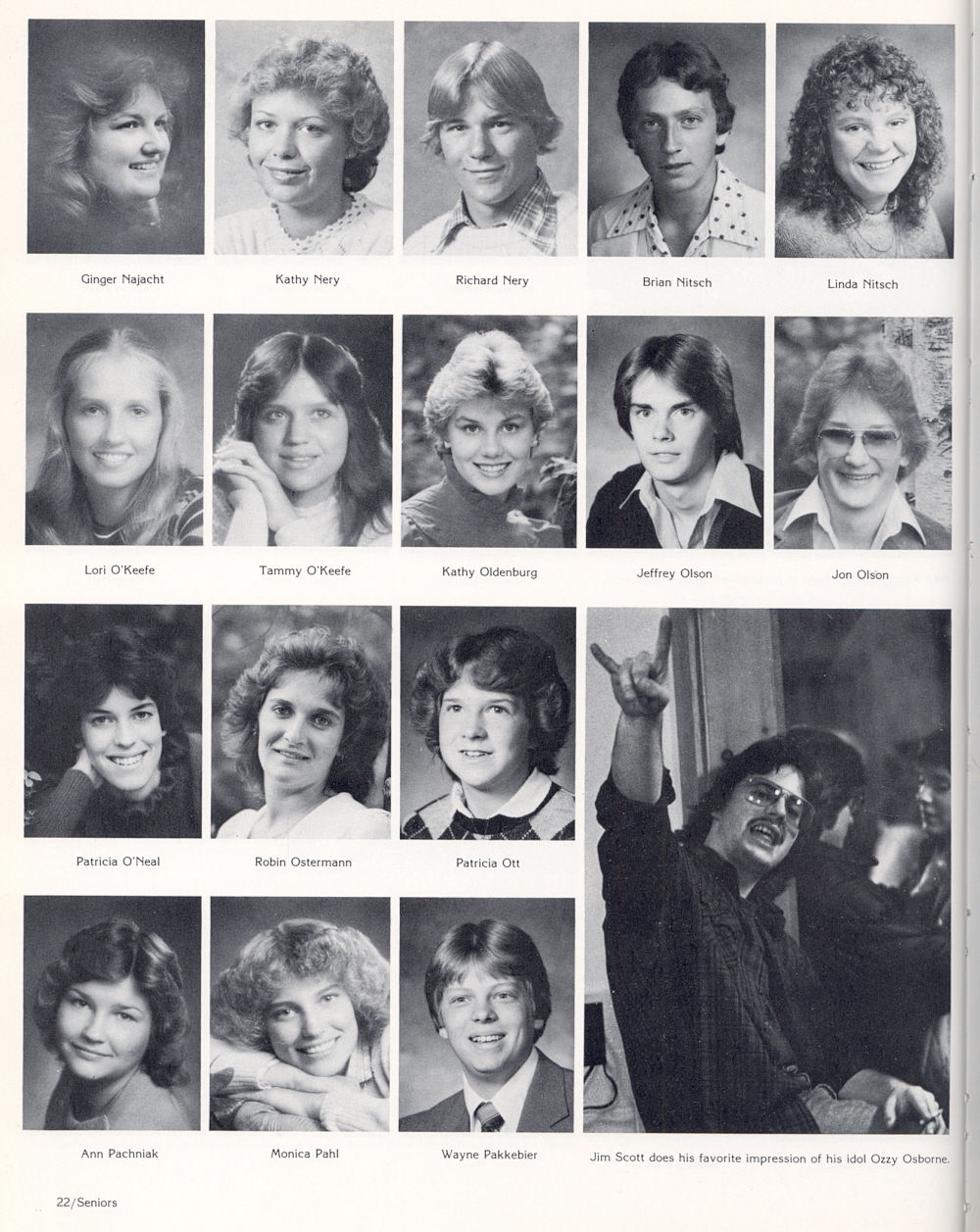 1983 Sheboygan South High School, Page 22: Ginger Najacht, Kathy Nery, Richard Nery, Brian Nitsch, Linda Nitsch, Lori O'Keefe, Tammy O'Keefe, Kathy Oldenburg, Jeffrey Olson, Jon Olson, Patricia O'Neal, Robin Ostermann, Patricia Ott, Ann Pachniak, Monica Pahl, Wayne Pakkebier.
