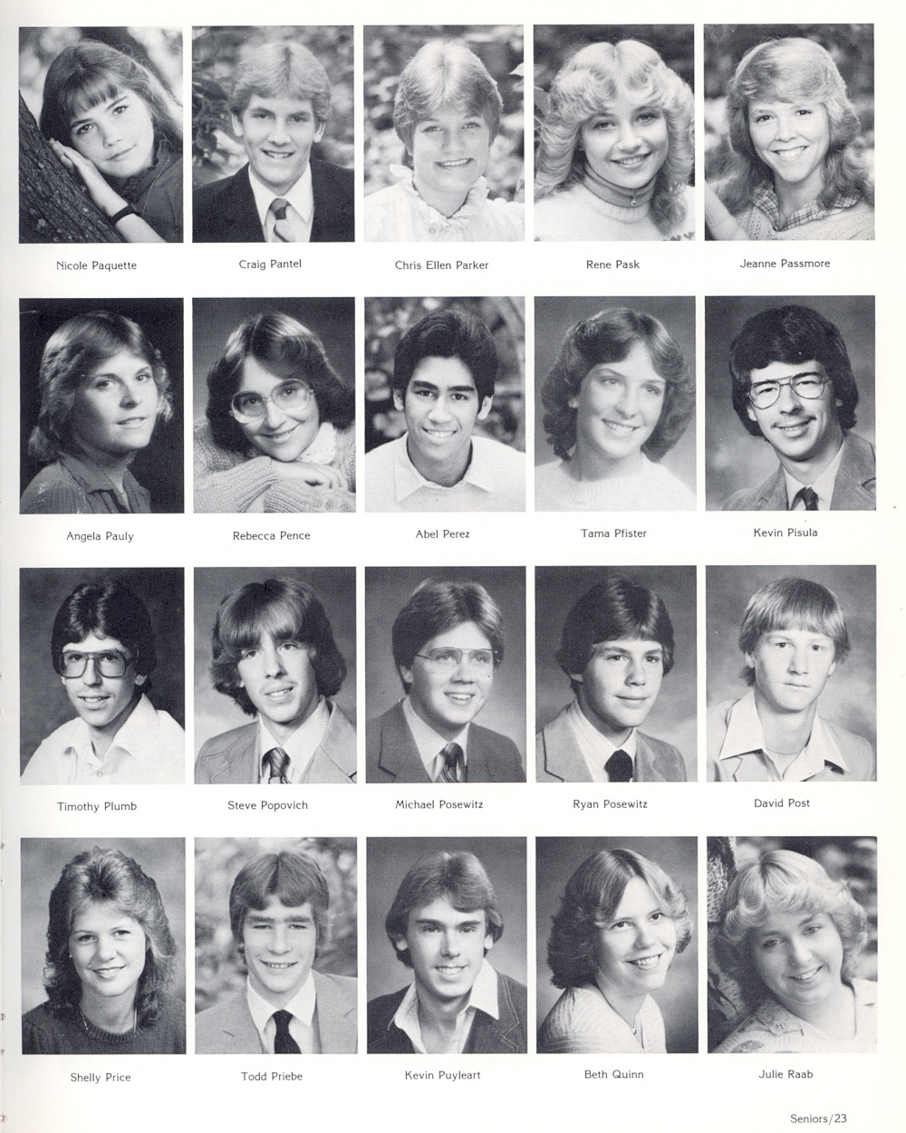1983 Sheboygan South High School, Page 23: Nicole Paquette, Craig Pantel, Chris Ellen Parker, Rene Pask, Jeanne Passmore, Angela Pauly, Rebecca Pence, Abel Perez, Tama Pfister, Kevin Pisula, Timothy Plumb, Steve Popovich, Michael Posewitz, Ryan Posewitz, David Post, Shelly Price, Todd Priebe, Kevin Puyleart, Beth Quinn, Julie Raab.