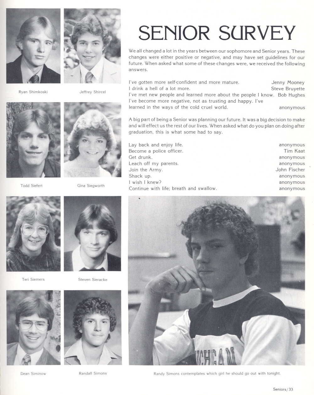 1983 Sheboygan South High School, Page 33: Ryan Shimkoski, Jeffrey Shircel, Todd Siefert, Gina Siegworth, Teri Siemers, Steven Sieracke, Dean Siminow, Randall Simons.