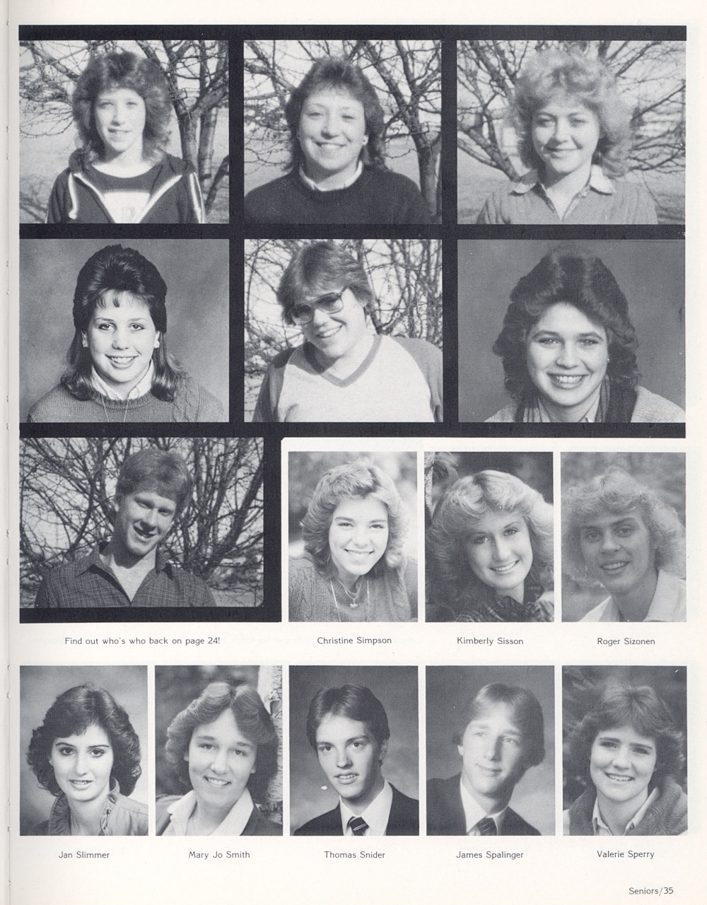 1983 Sheboygan South High School, Page 35: Christine Simpson, Kimberly Sisson, Roger Sizonen, Jan Slimmer, Mary Jo Smith, Thomas Snider, James Spalinger, Valerie Sperry.
