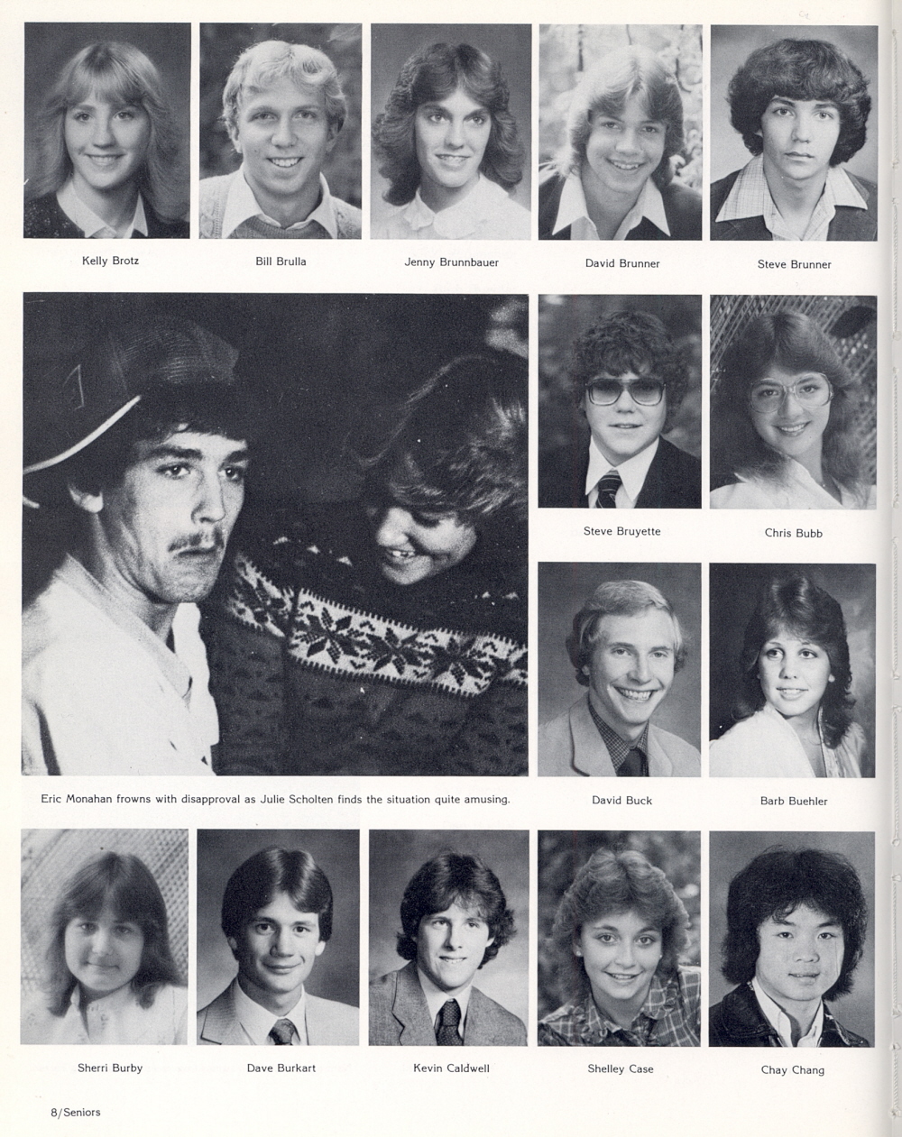 1983 Sheboygan South High School, Page 8: Kelly Brotz, Bill Brulla, Jenny Brunnbauer, David Brunner, Steve Brunner, Steve Bruyette, Chris Bubb, David Buck, Barb Buehler, Sherri Burby, Dave Burkart, Kevin Caldwell, Shelley Case, Chay Chang.
