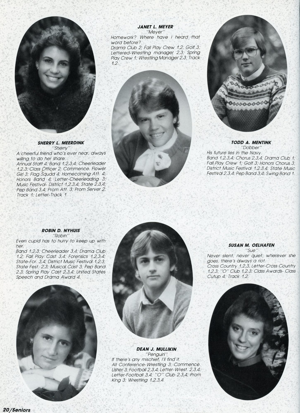 1984 Oostburg High School, Page 20: Sherry L. Meerdink, Todd A. Meerdink, Janet L. Meyer, Dean J. Mullikin, Robin D. Myhuis, Susan M. Oelhafen.