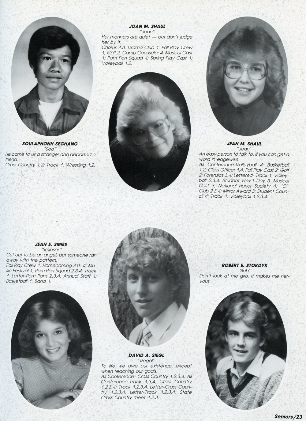 1984 Oostburg High School, Page 23: Soulaphonh Sechang, Jean M. Shaul, Joan M. Shaul, David A. Siegl, Jean E. Smies, Robert E. Stokdyk.