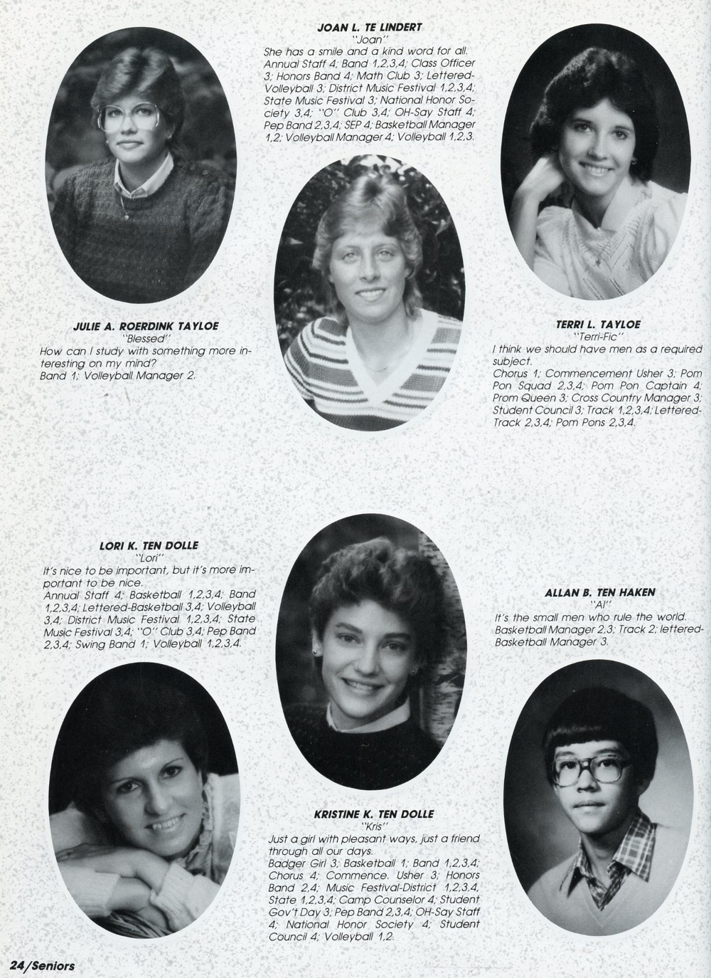 1984 Oostburg High School, Page 24: Julie A. Roerdink Tayloe, Terri L. Tayloe, Joan L. Te Lindert, Kristine K. Ten Dolle, Lori K. Ten Dolle, Allan B. Ten Haken.