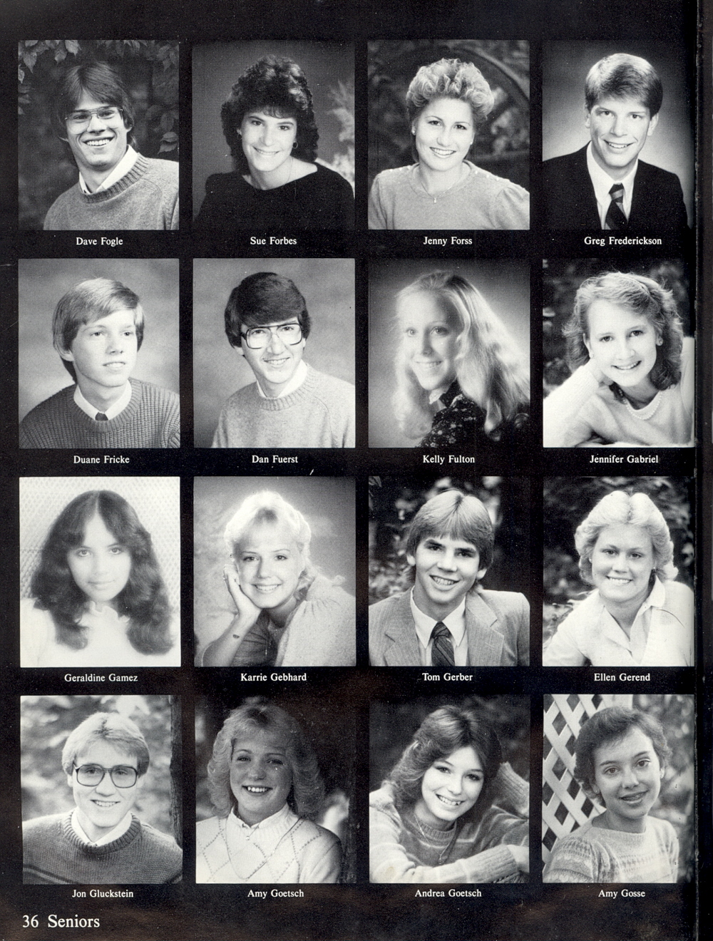 1984 Sheboygan North High School, Page 36: Dave Fogle, Sue Forbes, Jenny Forss, Greg Frederickson, Duane Fricke, Dan Fuerst, Kelly Fulton, Jennifer Gabriel, Geraldine Gamez, Karrie Gebhard, Tom Gerber, Ellen Gerend, Jon Gluckstein, Amy Goetsch, Andrea Goetsch, Amy Gosse.