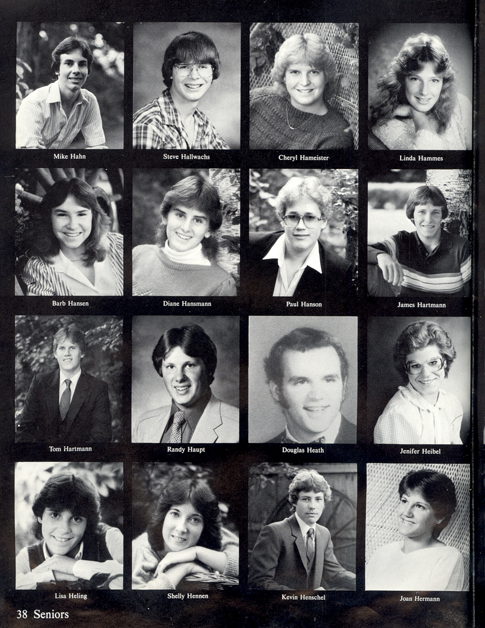 1984 Sheboygan North High School, Page 38: Mike Hahn, Steve Hallwachs, Cheryl Haneister, Linda Hammes, Barb Hansen, Diane Hansmann, Paul Hanson, James Hartmann, Tom Hartmann, Randy Haupt, Douglas Heath, Jenifer Heibel, Lisa Heling, Shelly Hennen, Kevin Henschel, Joan Hermann.