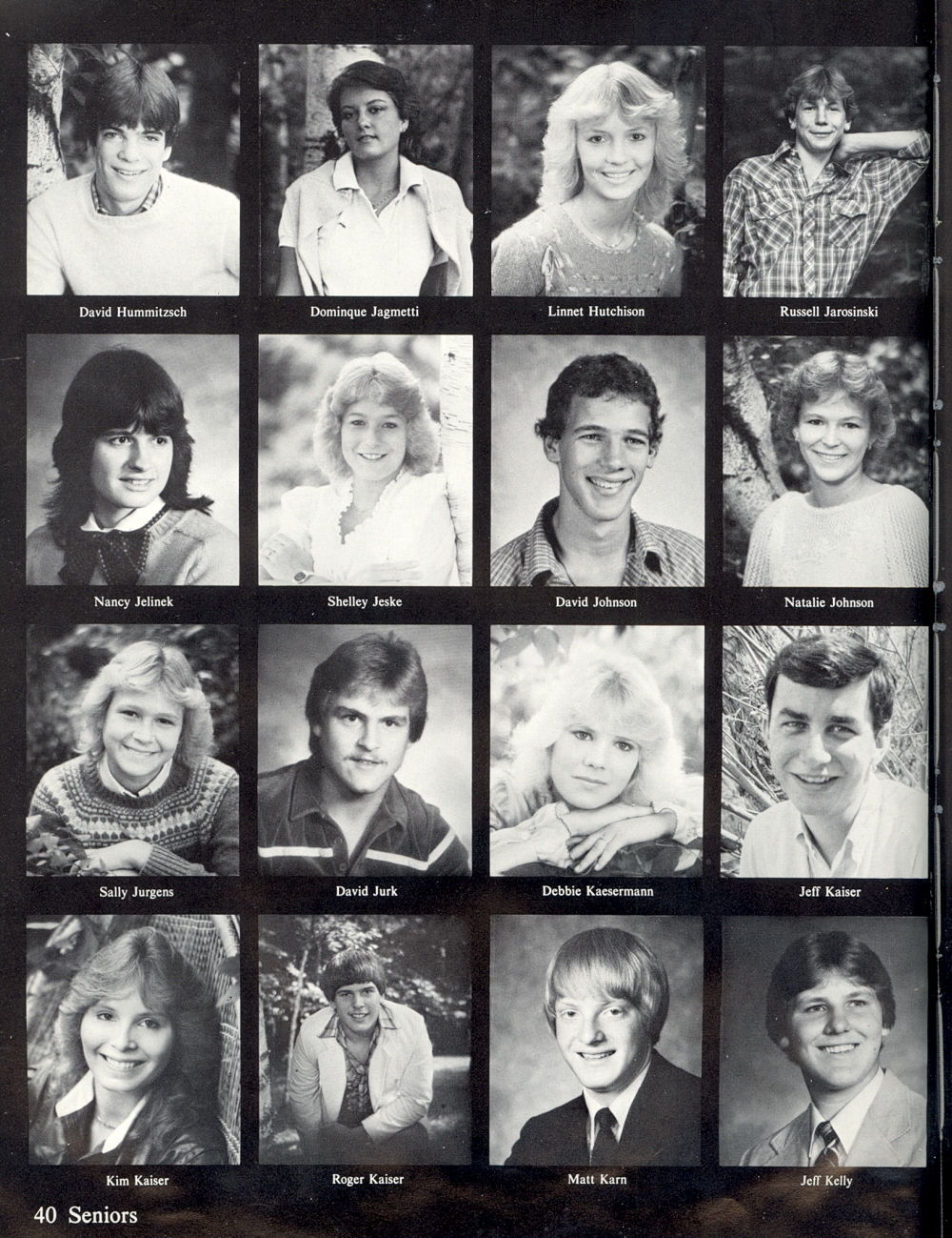 1984 Sheboygan North High School, Page 40: David Hummitzsch, Dominique Jagmetti, Linnet Hutchison, Russell Jarosinski, Nancy Jelinek, Shelley Jeske, David Johnson, Natalie Johnson, Sally Jurgens, David Jurk, Debbie Kaesermann, Jeff Kaiser, Kim Kaiser, Roger Kaiser, Matt Karn, Jeff Kelly.