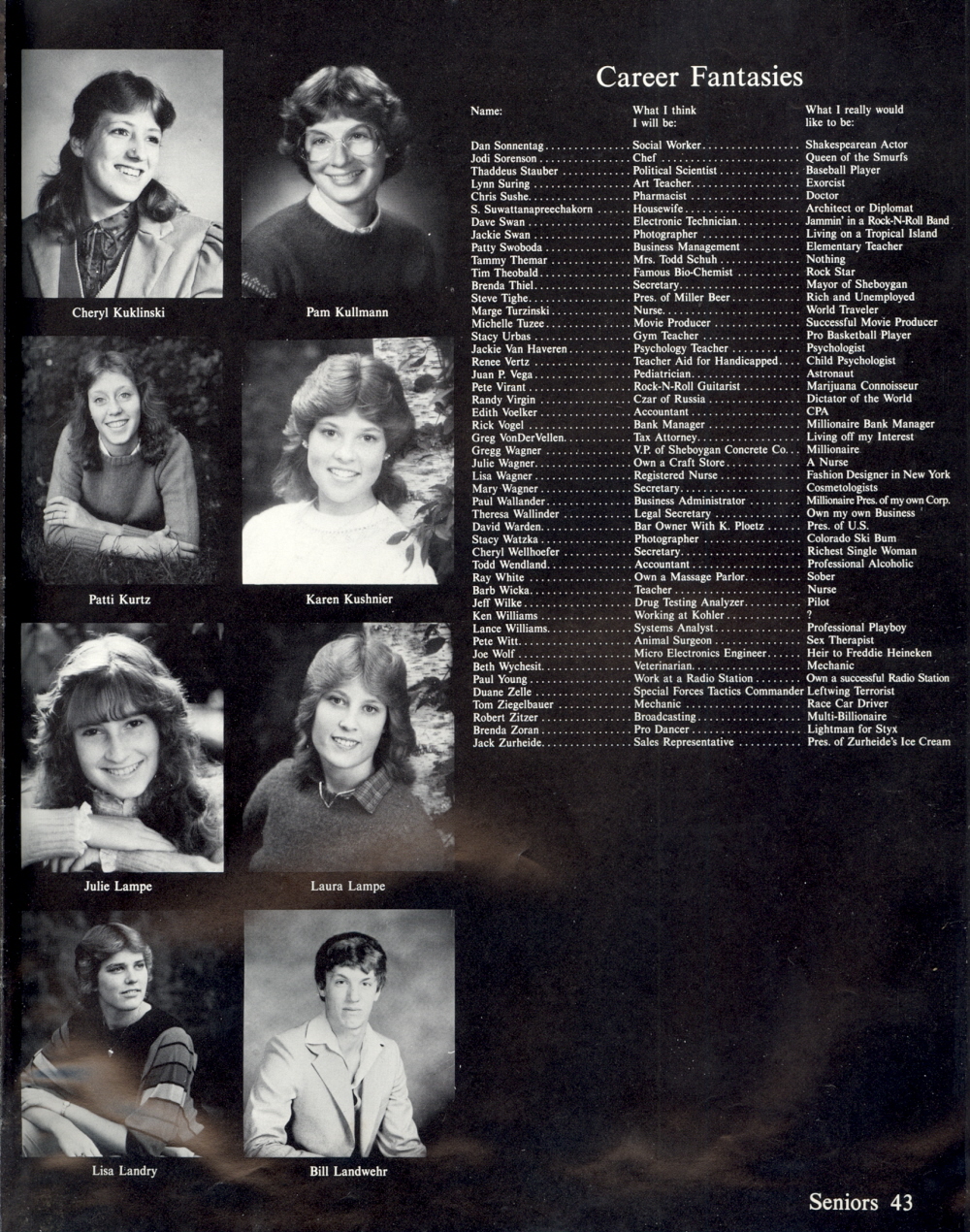 1984 Sheboygan North High School, Page 43: Cheryl Kuklinski, Pam Kullmann, Patti Kurtz, Karen Kushnier, Julie Lampe, Laura Lampe, Lisa Landry, Bill Landwehr.