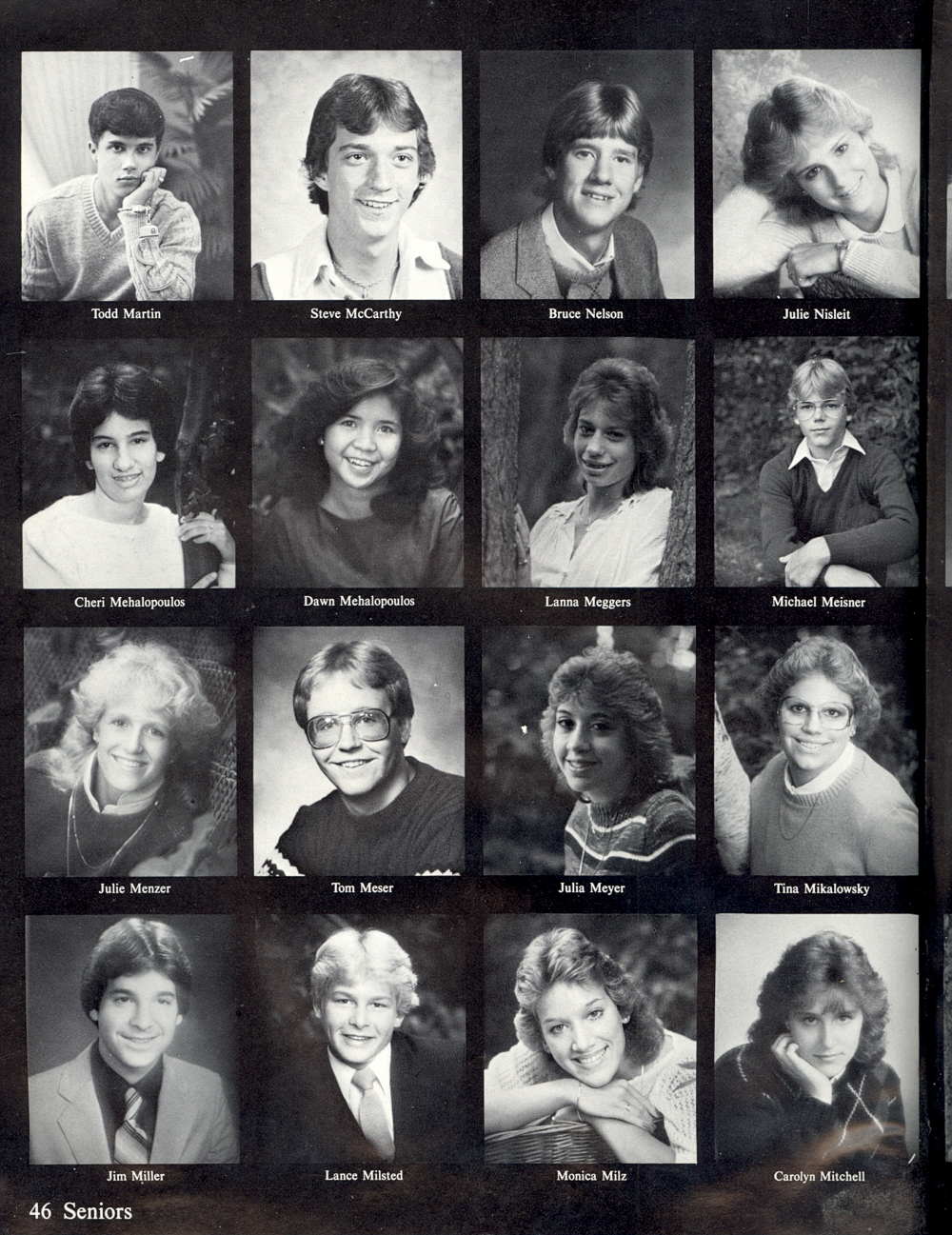 1984 Sheboygan North High School, Page 46: Todd Martin, Steve McCarthy, Bruce Nelson, Julie Nisleit, Cheri Mehalopoulos, Dawn Mehalopoulos, Lanna Meggers, Michael Meisner, Julie Menzer, Tom Meser, Julia Meyer, Tina Mikalowsky, Jim Miller, Lance Milsted, Monica Milz, Carolyn Mitchell.