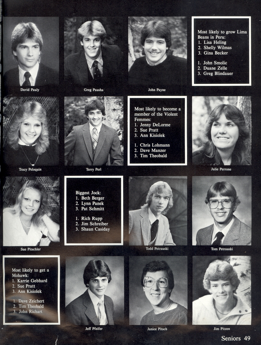 1984 Sheboygan North High School, Page 49: David Pauly, Greg Pausha, John Payne, Tracy Peloquin, Terry Perl, Julie Perrone, Sue Pitschler, Todd Petrauski, Tom Petrauski, Jeff Pfeifer, Janice Pitsch, Jim Pitzen.