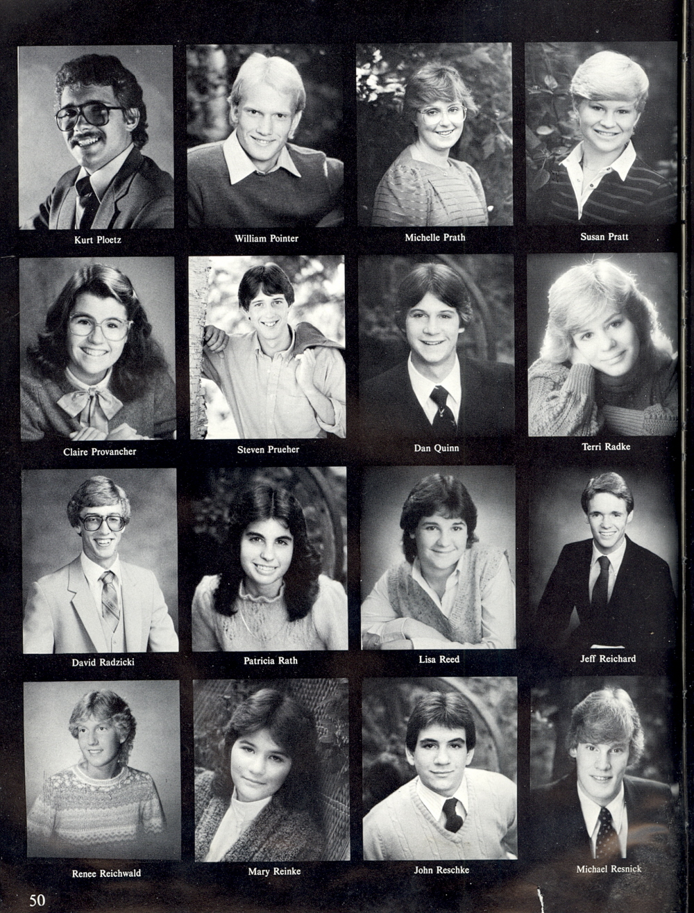 1984 Sheboygan North High School, Page 50: Kurt Ploetz, William Pointer, Michelle Prath, Susan Pratt, Claire Provancher, Steven Prueher, Dan Quinn, Terri Radke, David Radzicki, Patricia Rath, Lisa Reed, Jeff Reichard, Renee Reichwald, Mary Reinke, John Reschke, Michael Resnick.