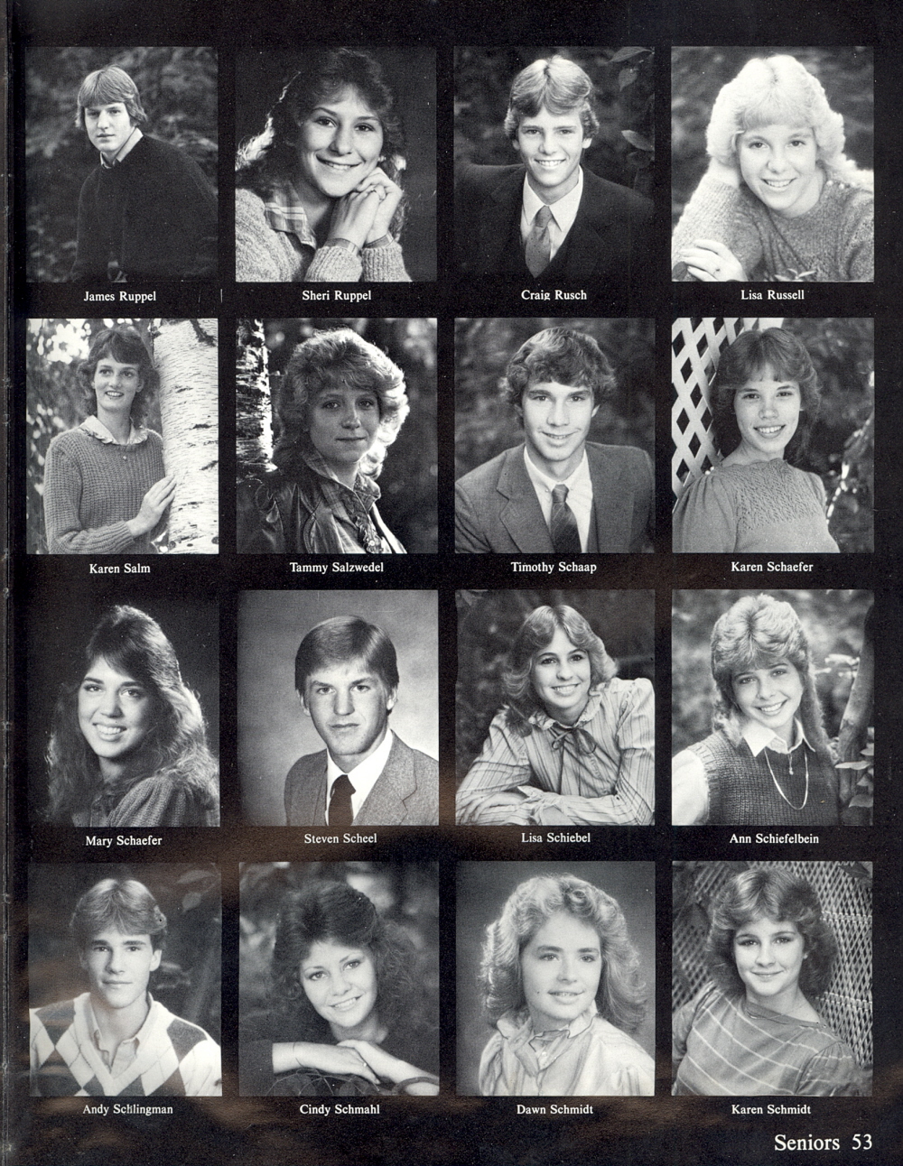 1984 Sheboygan North High School, Page 53: James Ruppel, Sheri Ruppel, Craig Rusch, Lisa Russell, Karen Salm, Tammy Salzwedel, Timothy Schaap, Karen Schaefer, Mary Schaefer, Steven Scheel, Lisa Schiebel, Ann Schiefelbein, Andy Schlingman, Cindy Schmahl, Dawn Schmidt, Karen Schmidt.