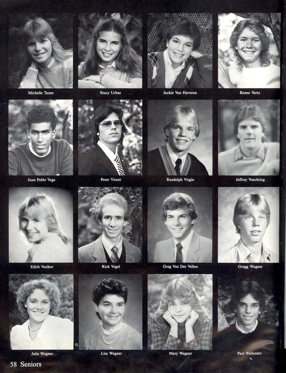 1984 Sheboygan North High School, Page 58: Michelle Tuzee, Stacy Urbas, Jackie Van Haveran, Renee Vertz, Juan Pablo Vega, Peter Virant, Randolph Virgin, Jeffrey Voechting, Edith Voelker, Rick Vogel, Greg Von Der Vellen, Gregg Wagner, Julie Wagner, Lisa wagner, Mary Wagner, Paul Wallander.