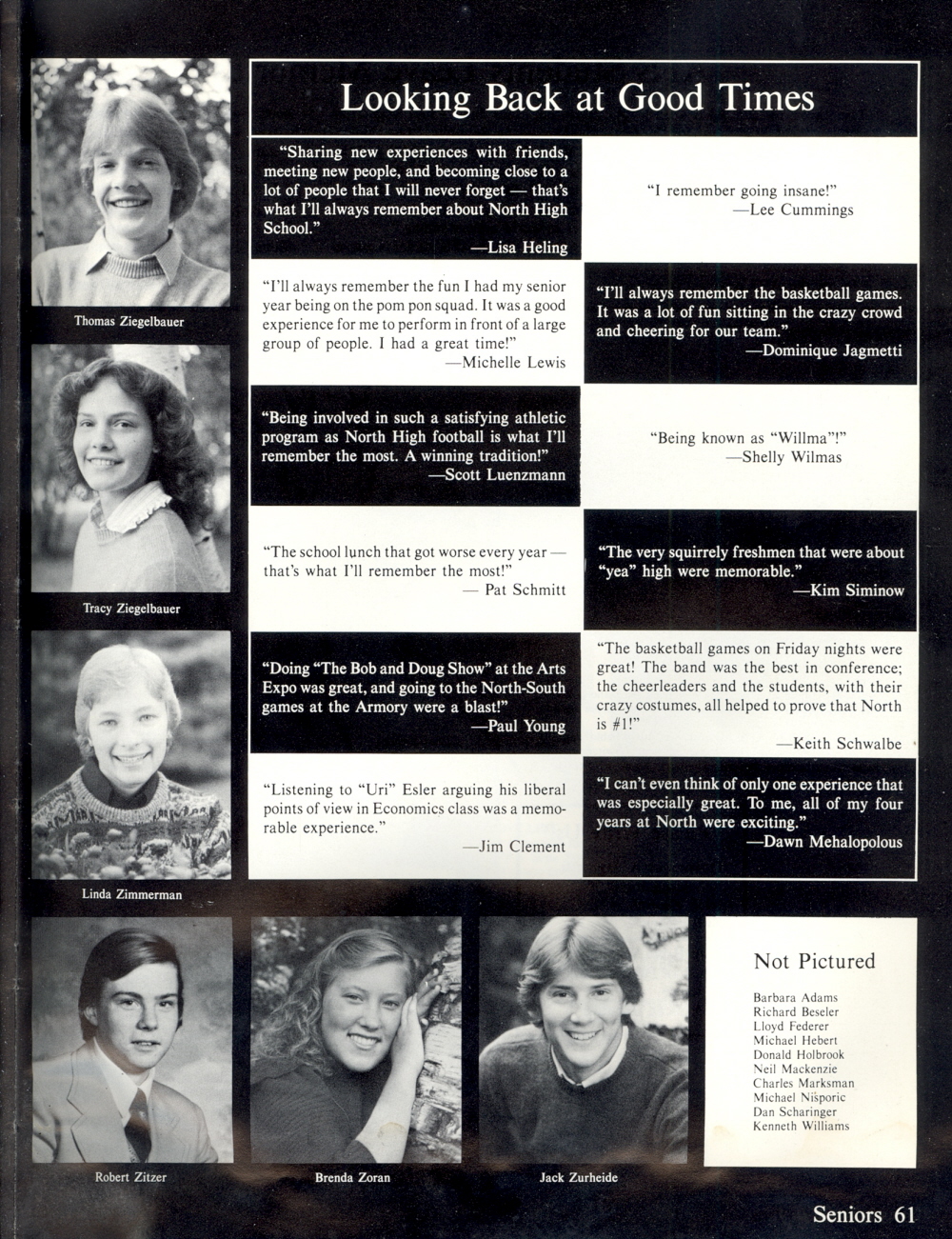 1984 Sheboygan North High School, Page 61: Thomas Ziegelbauer, Tracy Ziegelbauer, Linda Zimmerman, Robert Zitzer, Brenda Zoran, Jack Zurheide, Barbara Adams, Richard Beseler, Lloyd Federer, Michael Hebert, Donald Holbrook, Neil Mackenzie, charles Marksman, Michael Nisporic, Dan Scharinger, Kenneth Williams.