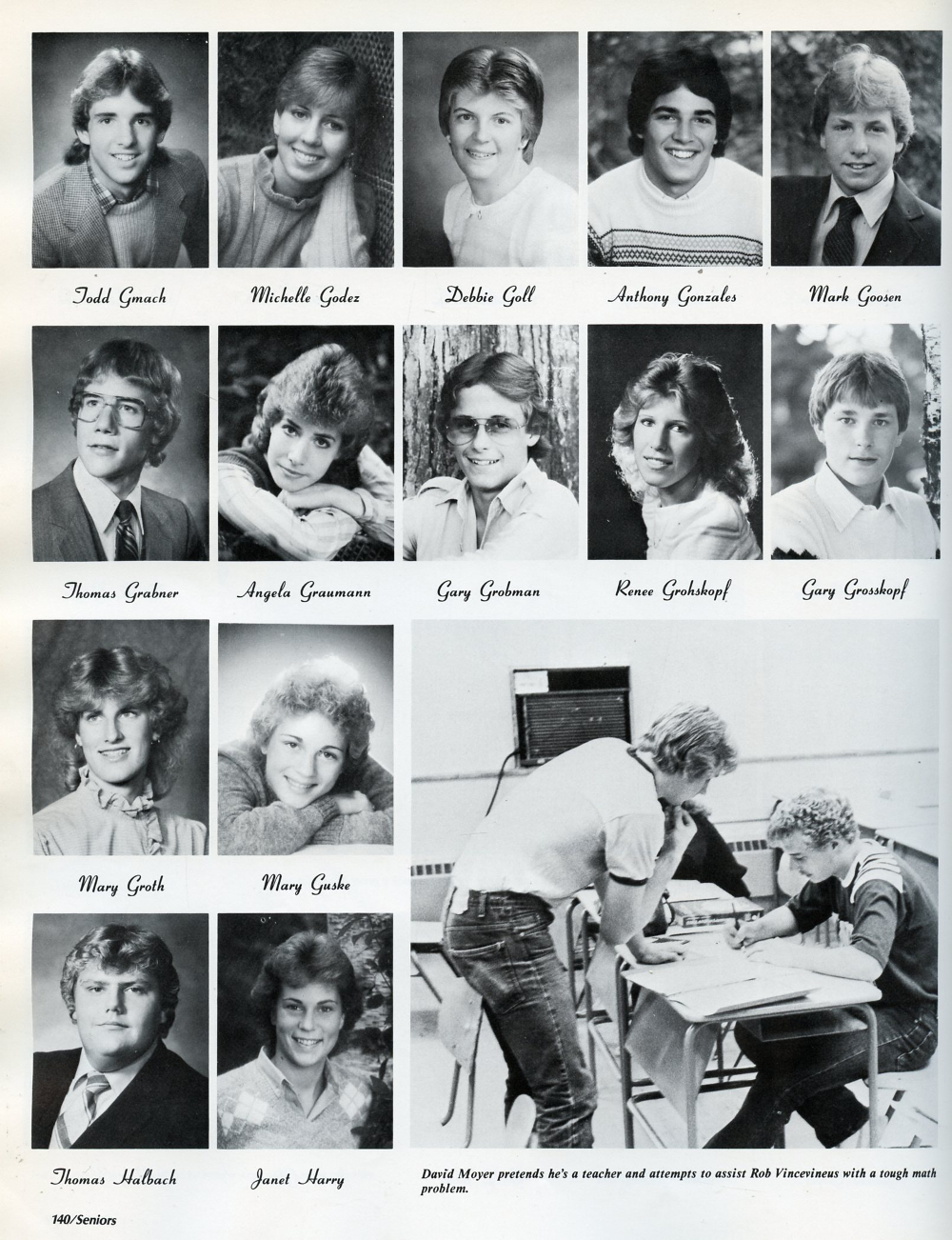 1984 Sheboygan South High School, Page 140: Todd Gmach, Michelle Godez, Debbie Goll, Anthony Gonzales, Mark Goosen, Thomas Grabner, Angela Graumann, Gary Grobman, Renee Grohskopf, Gary Grosskopf, Mary Groth, Mary Guske, Thomas Halbach, Janet Harry.