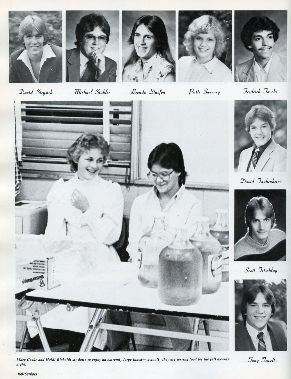 1984 Sheboygan South High School, Page 160: David Strysick, Michael Stubler, Brenda Stuefen, Patti Sweeney, Fredrick Tasche, David Taubenheim, Scott Tetschlag, Tony Tewelis.