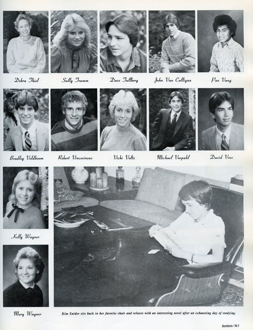 1984 Sheboygan South High School, Page 161: Debra Thiel, Sally Trumm, Dave Tullberg, John Van Calligan, Pao Vang, Bradley Veldboom, Robert Vincevineus, Vicki Voltz, Michael Vorpahl, David Voss, Kelly Wagner, Mary Wagner.