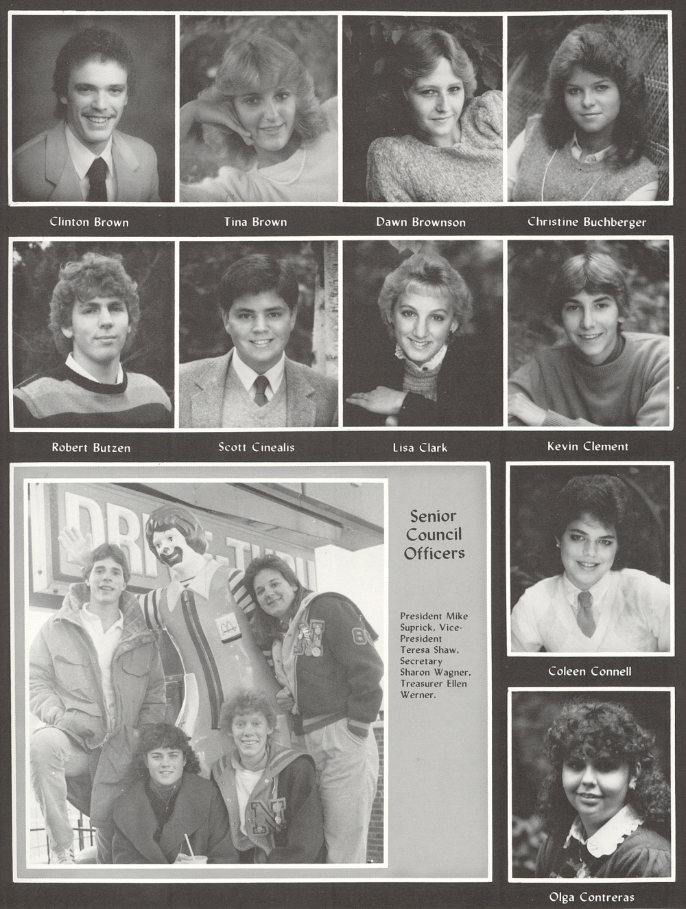 1985 Sheboygan North High School Yearbook, page 45: Clinton Brown, Tina Brown, Dawn Brownson, Christine Buchberger, Robert Butzen, Scott Cinealis, Lisa Clark, Kevin Clement, Coleen Connell, Olga Contreras.