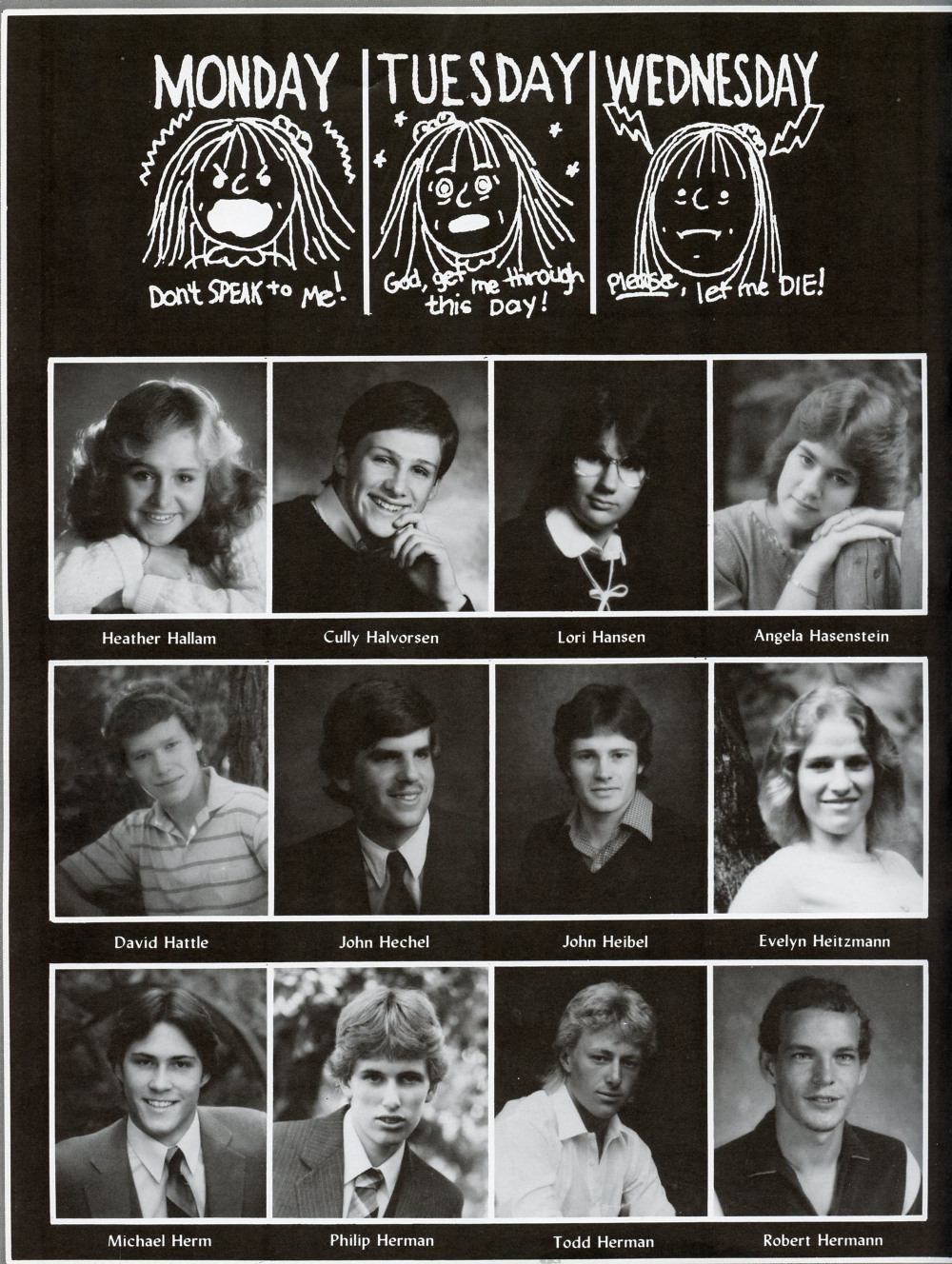 1985 Sheboygan North High School Yearbook, page 50: Heather Hallam, Cully Halvorsen, Lori Hansen, Angela Hasenstein, David Hattle, John Hechel, John Heibel, Evelyn Heitzmann, Michael Herm, Philip Herman, Todd Herman, Robert Hermann.