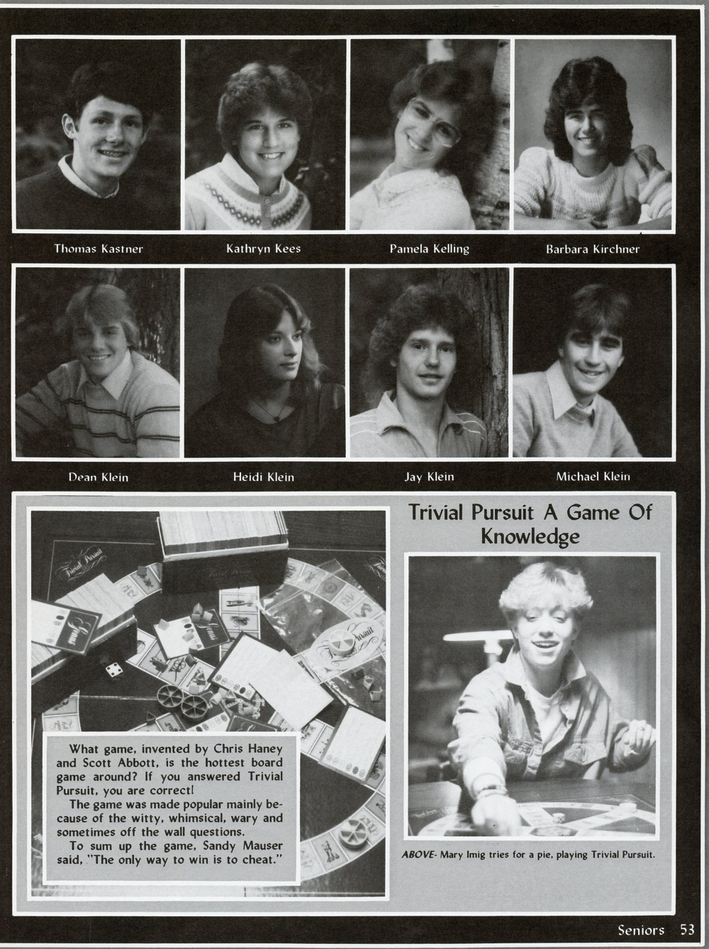 1985 Sheboygan North High School Yearbook, page 53: Thomas Kastner, Kathryn Kees, Pamela Kelling, Barbara Kirchner, Dean Klein, Heidi Klein, Jay Klein, Michael Klein.