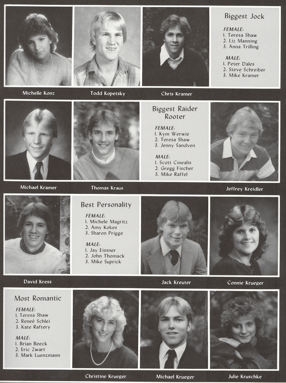 1985 Sheboygan North High School Yearbook, page 55: Michelle Konz, Todd Kopetsky, Chris Kramer, Michael Kramer, Thomas Kraus, Jeffrey Kreidler, David Kress, Jack Kreuter, Connie Krueger, Christine Krueger, Michael Krueger, Julie Kruschke.