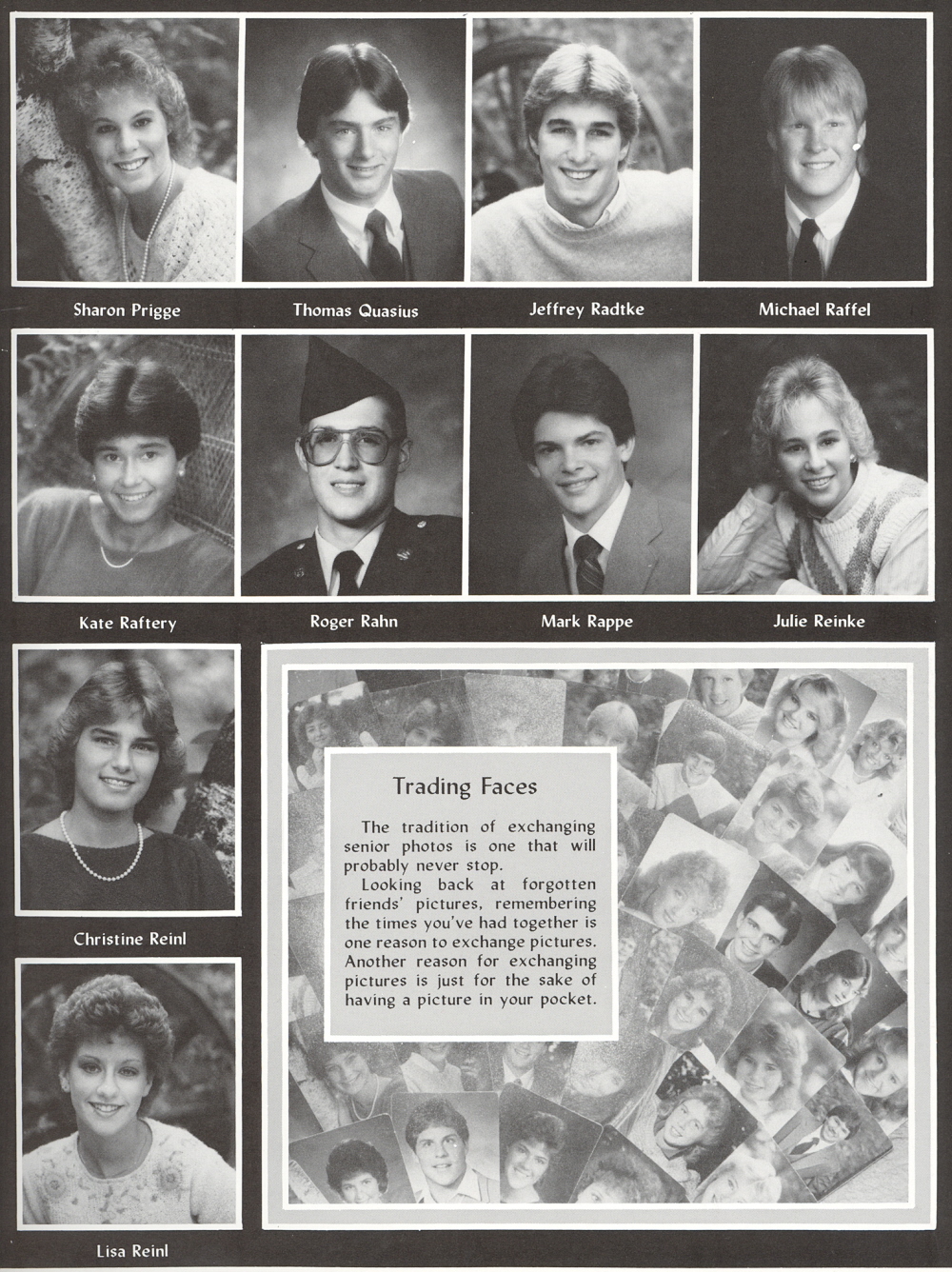 1985 Sheboygan North High School Yearbook, page 63: Sharon Prigge, Thomas Quasius, Jeffrey Radtke, Michael Raffel, Kate Raftery, Roger Rahn, Mark Rappe, Julie Reinke, Christine Reinl, Lisa Reinl.