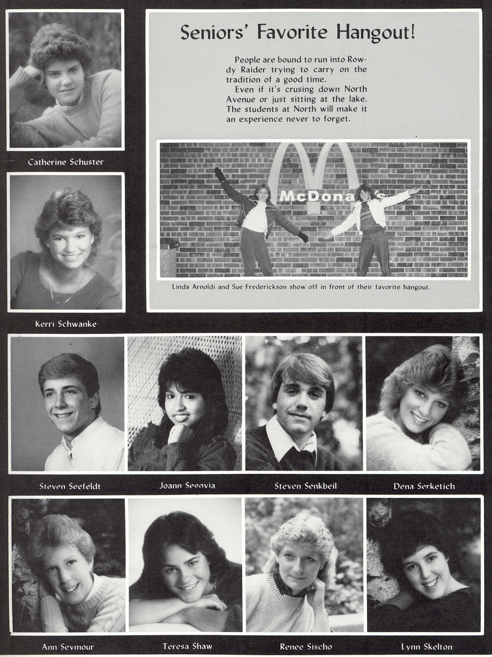 1985 Sheboygan North High School Yearbook, page 67: Catherine Schuster, Kerri Schwanke, Steven Seefeldt, Joann Segovia, Steven Senkbeil, Dena Serketich, Ann Seymour, Teresa Shaw, Renee Sischo, Lynn Skelton.