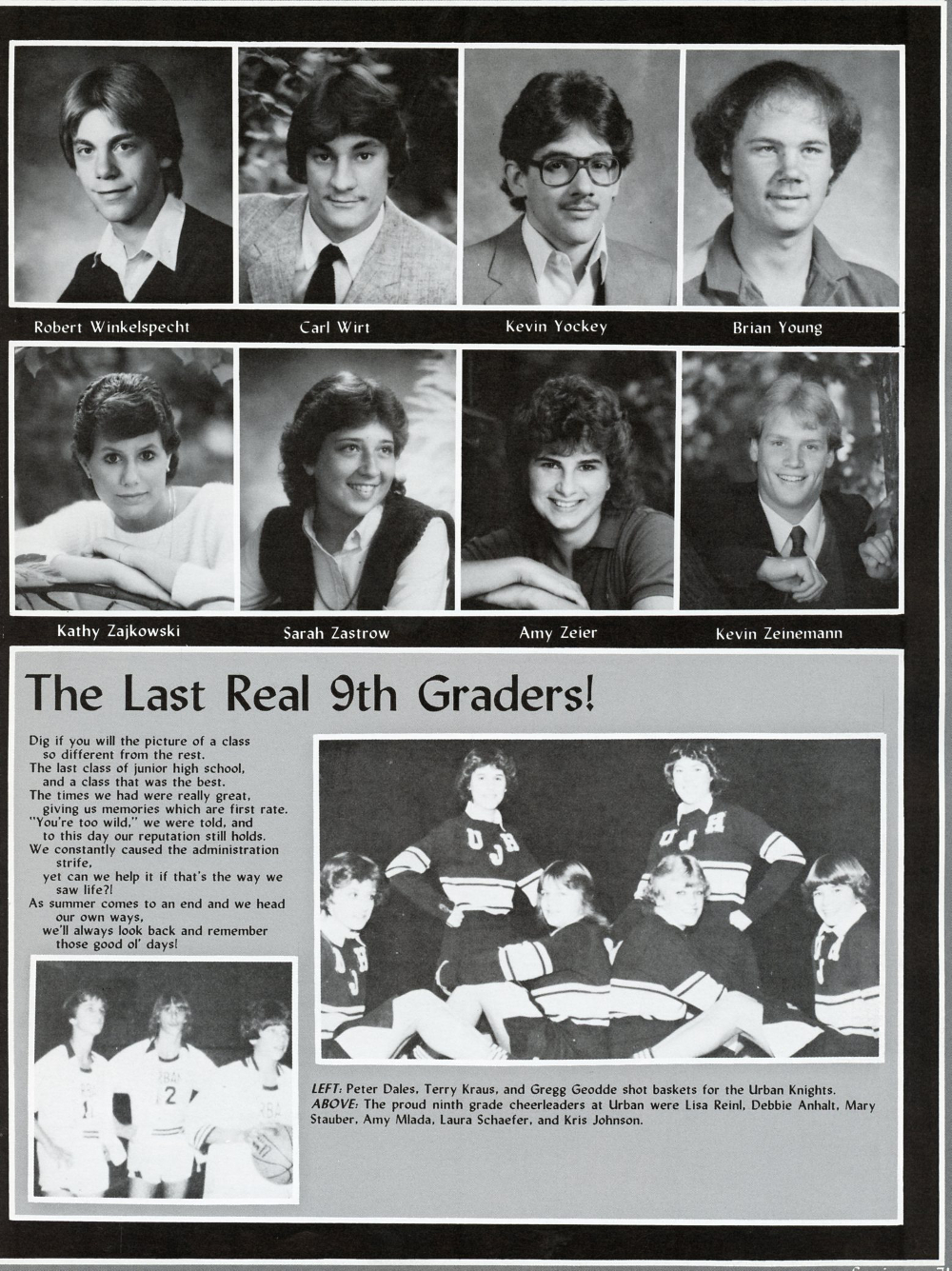 1985 Sheboygan North High School Yearbook, page 71: Robert Winkelspecht, Carl Wirt, Kevin Yockey, Brian Young, Kathy Zajkowski, Sarah Zastrow, Amy Zeier, Kevin Zeinemann.