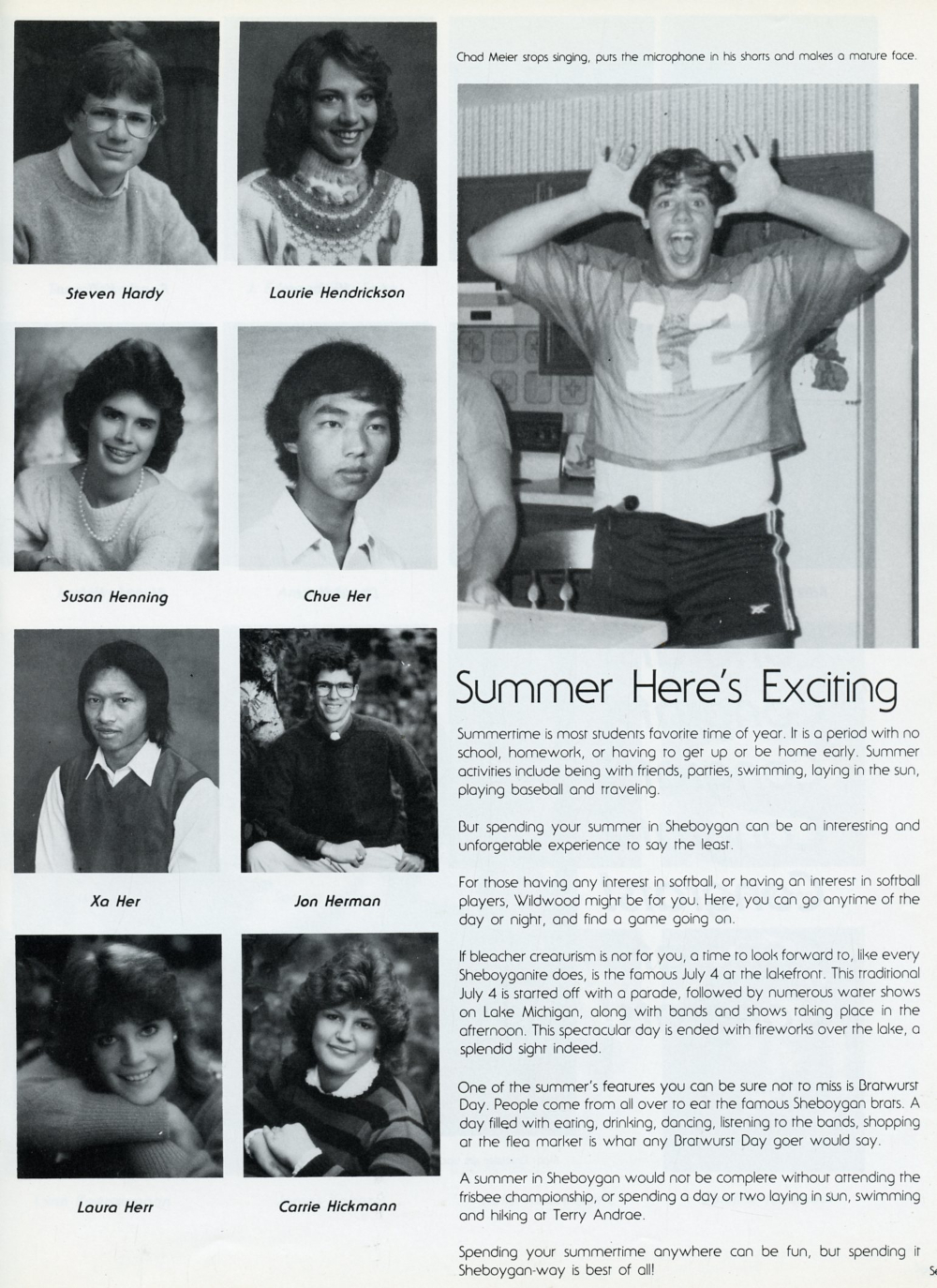 1985 Sheboygan South High School Yearbook Page 61: Steven Hardy, Laurie Hendrickson, Susan Henning, Chue Her, Xa Her, Jon Herman, Laura Herr, Carrie Hickmann.