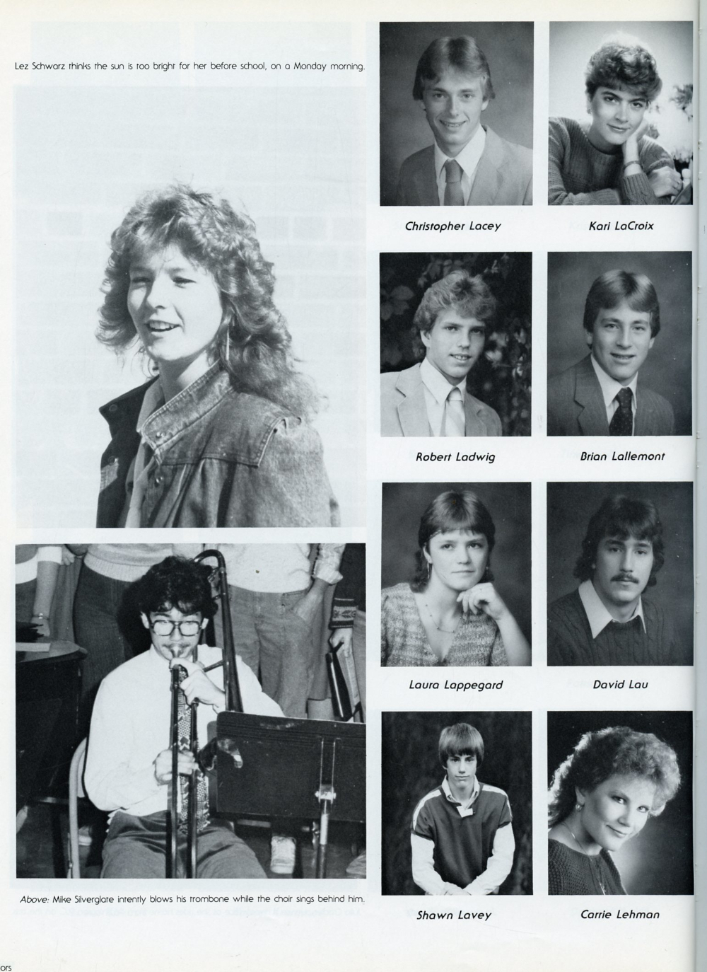 1985 Sheboygan South High School Yearbook Page 66: Christopher Lacey, Kari LaCroix, Robert Ladwig, Brian Lallemont, Laura Lappegard, David Lau, Shawn Lavey, Carrie Lehman.