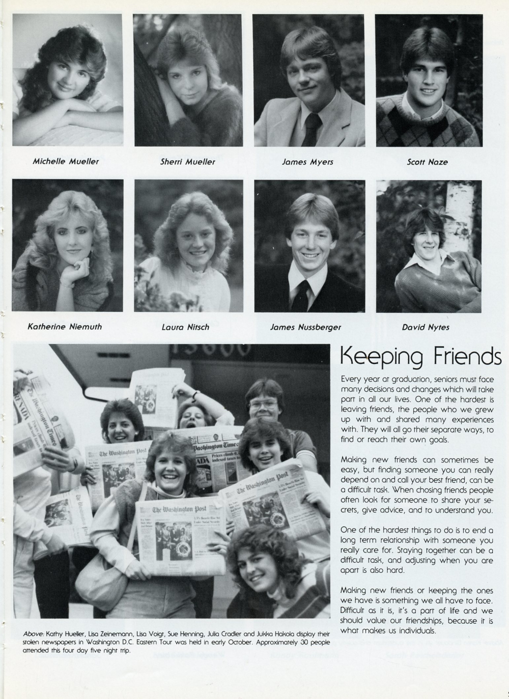 1985 Sheboygan South High School Yearbook Page 69: Michelle Mueller, Sherri Mueller, James Myers, Scott Naze, Katherine Niemuth, Laura Nitsch, James Nussberger, David Nytes.