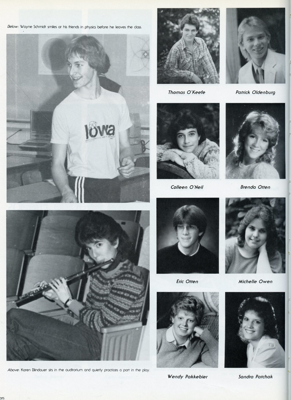 1985 Sheboygan South High School Yearbook Page 70: Thomas O'Keefe, Patrick Oldenburg, Colleen O'Neil, Brenda Otten, Eric Otten, Michelle Owen, Wendy Pakkebier, Sandra Patchak.