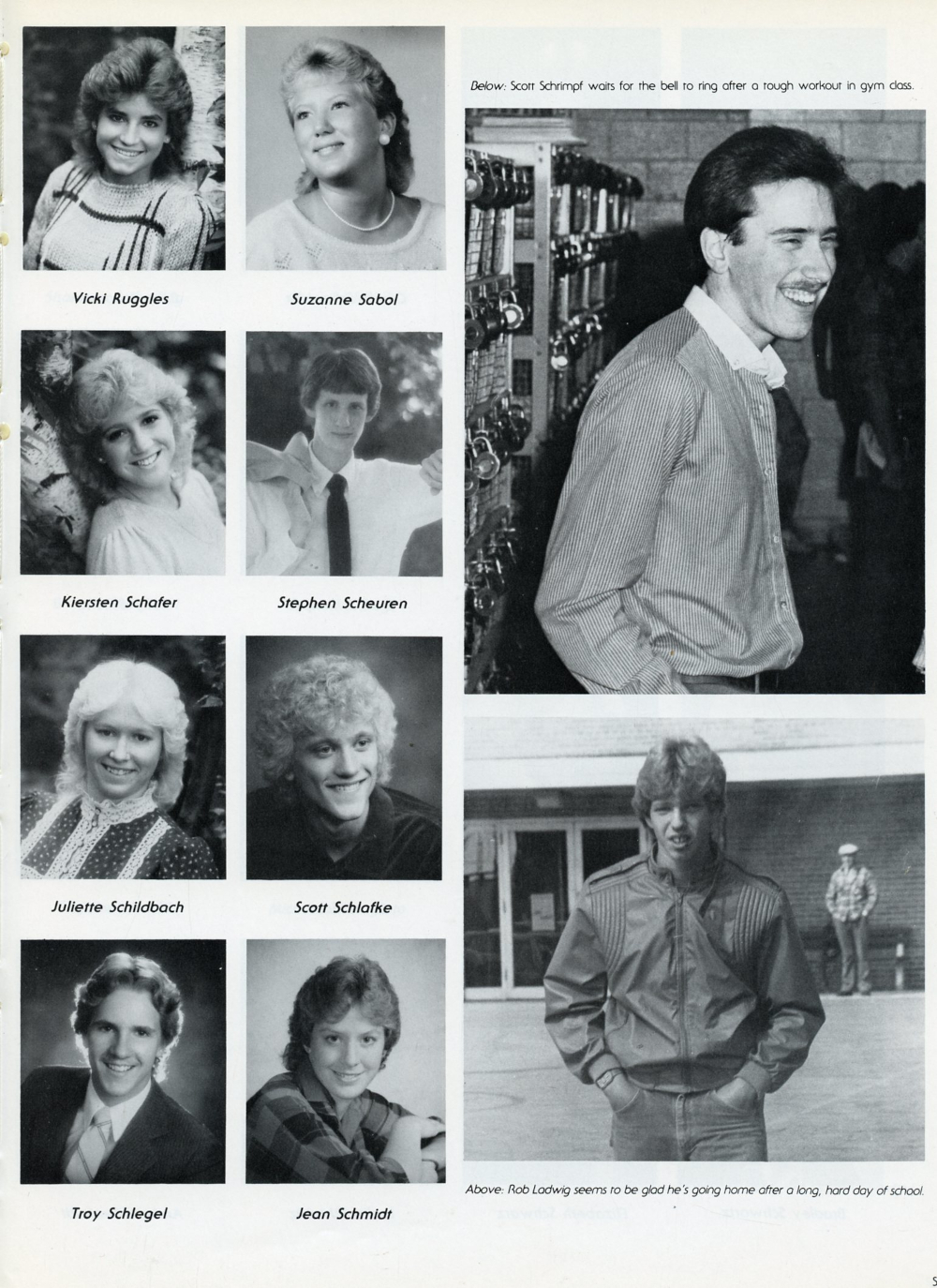 1985 Sheboygan South High School Yearbook Page 73: Vicki Ruggles, Suzanne Sabol, Kiersten Schafer, Stephen Scheuren, Juliette Schildbach, Scott Schlafke, Troy Schlegel, Jean Schmidt.