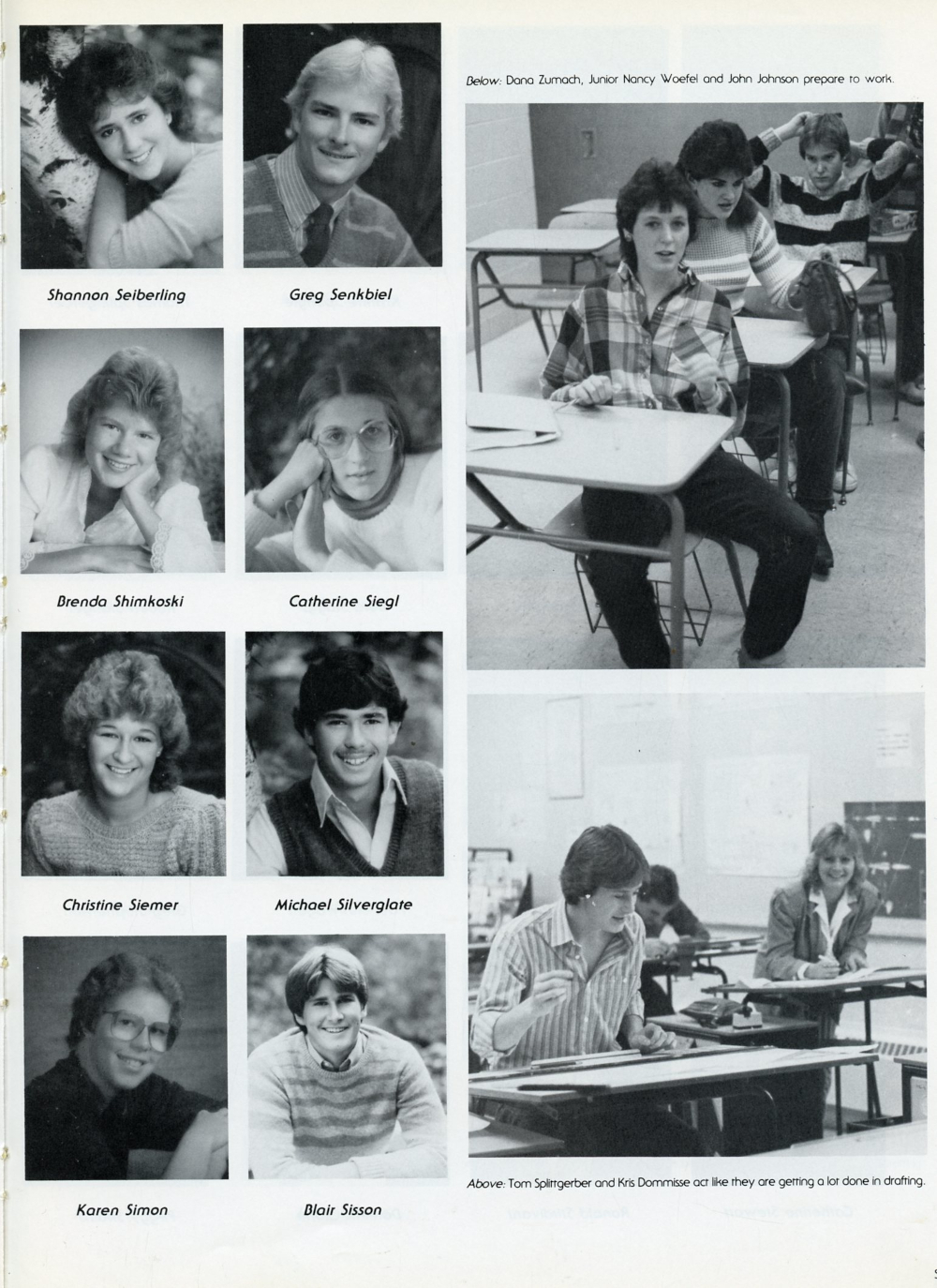 1985 Sheboygan South High School Yearbook Page 75: Shannon Seiberling, Greg Senkbeil, Brenda Shimkoski, Catherine Siegl, Christine Siemers, Michael Silverglate, Karen Simon, Blair Sisson.