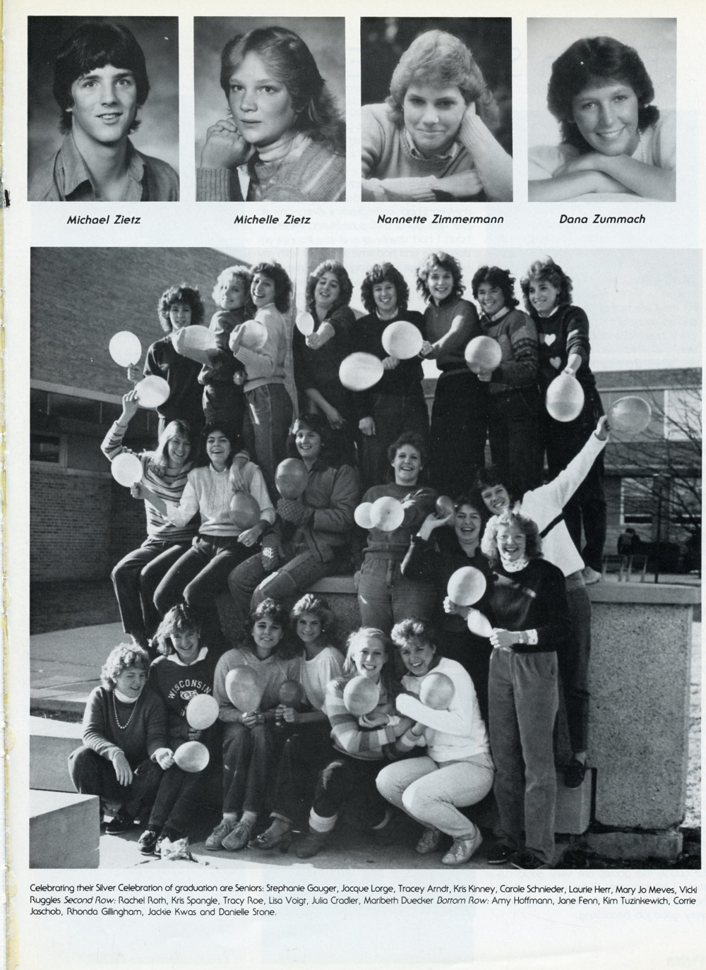 1985 Sheboygan South High School Yearbook Page 81: Michael Zietz, Michelle Zietz, Nannette Zimmermann, Dana Zummach.