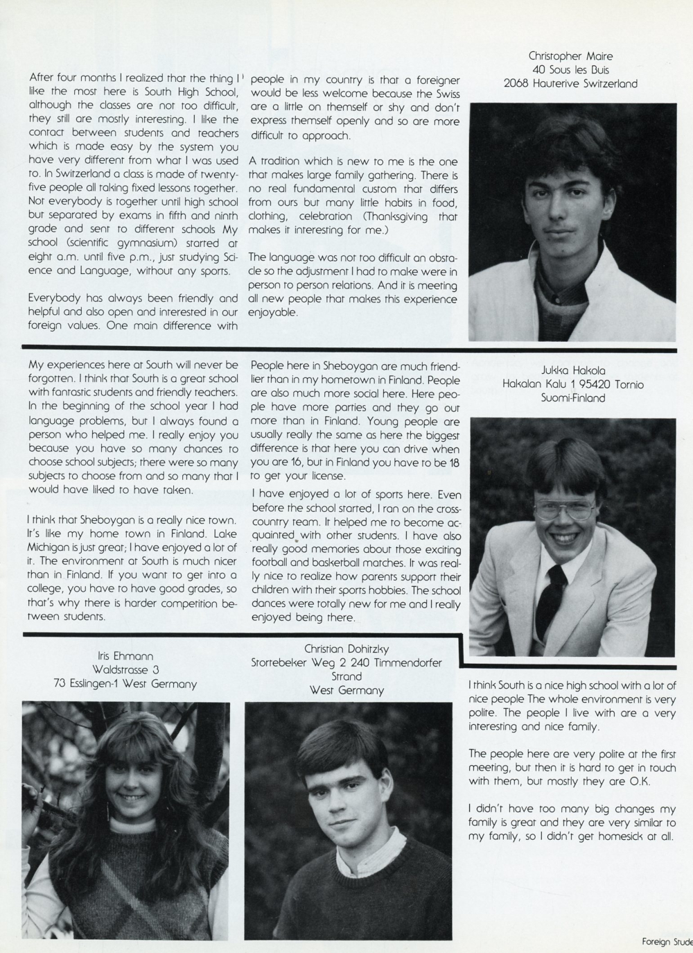1985 Sheboygan South High School Yearbook Page 83: Christopher Maire, Jukka Hakola, Iris Ehmann, Christian Dohitzky.