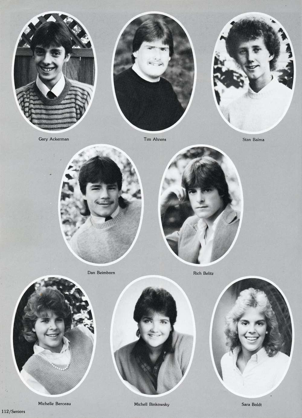 1986 Sheboygan Falls High School, Page 112: Gary Ackerman, Tim Ahrens, Stan Balma, Dan Beimborn, Rich Belitz, Michelle Berceau, Michell Binkowsky, Sara Boldt.
