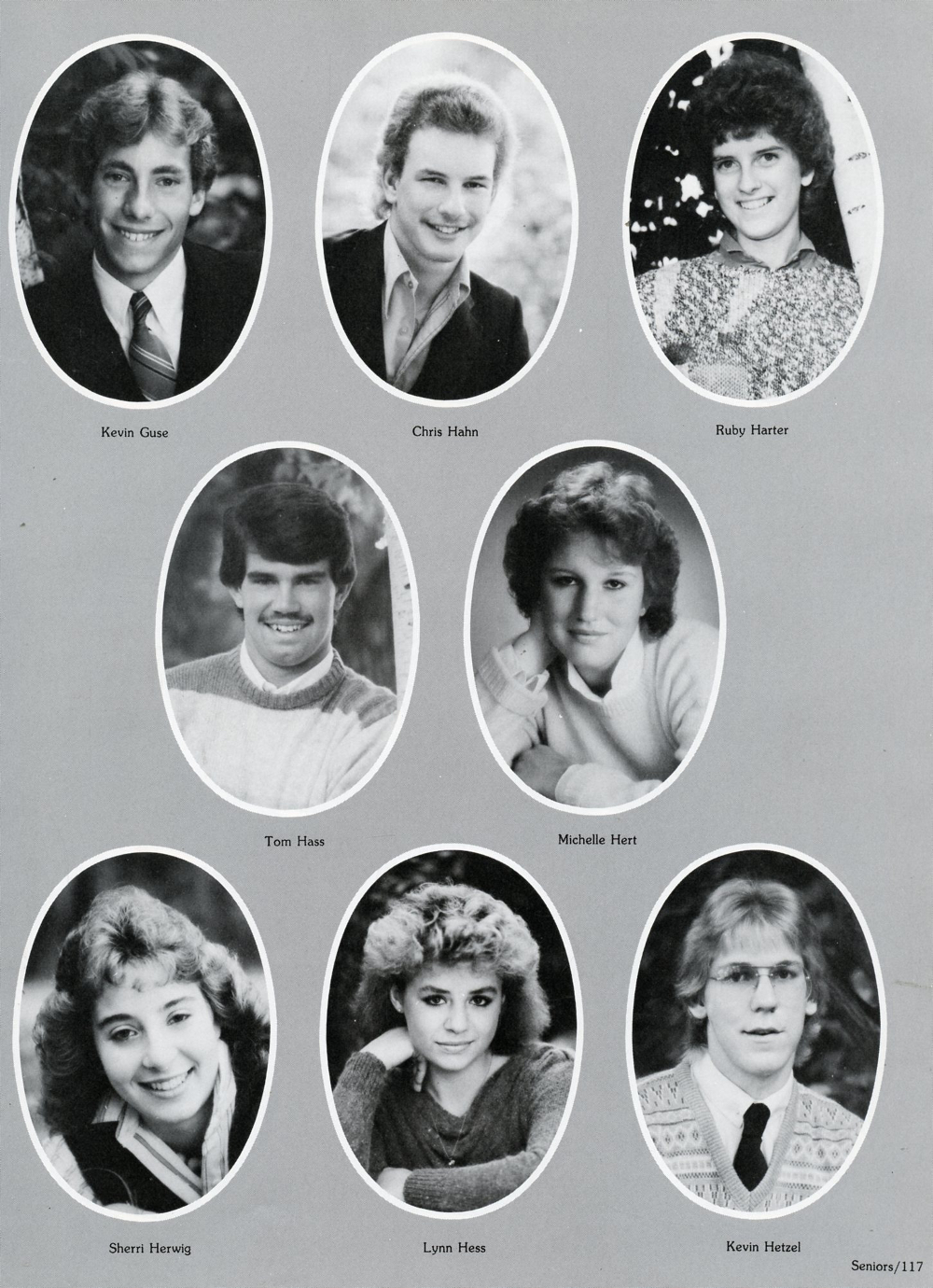 1986 Sheboygan Falls High School, Page 117: Kevin Guse, Chris Hahn, Ruby Harter, Tom Hass, Michelle Hert, Sherri Herwig, Lynn Hess, Kevin Hetzel.