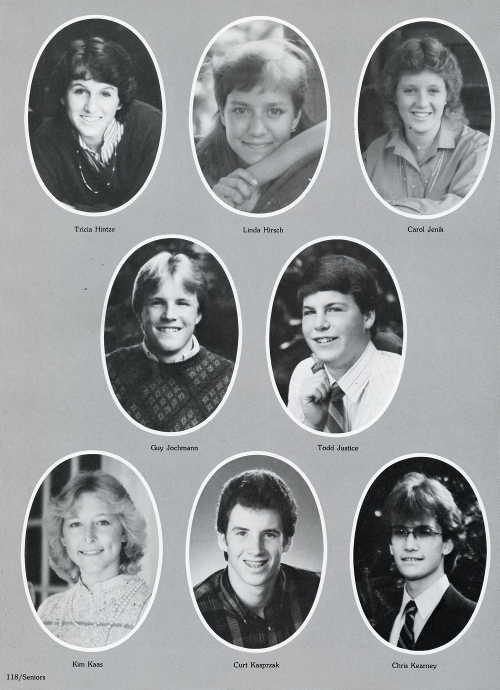 1986 Sheboygan Falls High School, Page 118: Tricia Hintze, Linda Hirsch, Carol Jenik, Guy Jochmann, Todd Justice, Kim Kaas, Curt Kasprzak, Chris Kearney.
