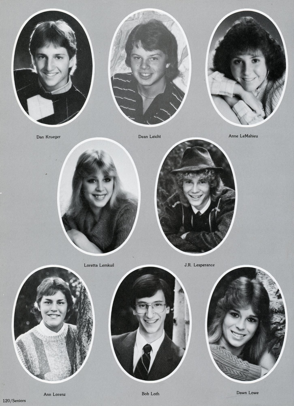 1986 Sheboygan Falls High School, Page 120: Dan Krueger, Dean Leicht, Anne LeMahieu, Loretta Lemkuil, J. R. Lesperance, Ann Lorenz, Bob Loth, Dawn Lowe.