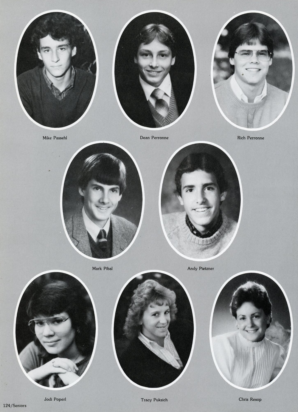 1986 Sheboygan Falls High School, Page 124: Mike Passehl, Dean Perronne, Rich Perronne, Mark Pibal, Andy Pietzner, Jodi Poperl, Tracy Puksich, Chris Resop.