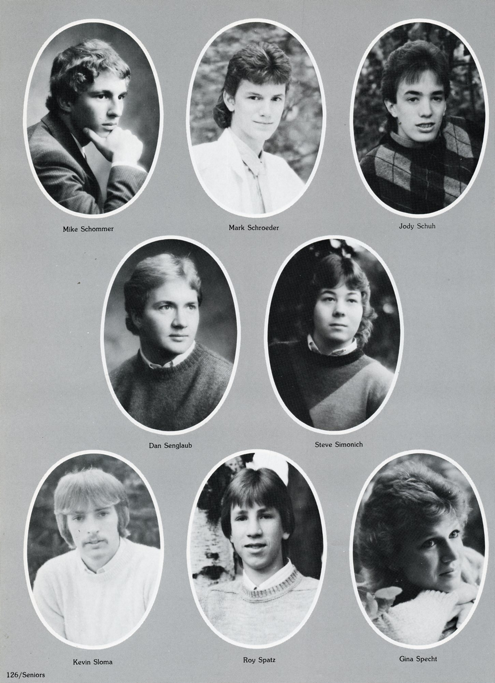1986 Sheboygan Falls High School, Page 126: Mike Schommer, Mark Schroeder, Jody Schuh, Dan Senglaub, Steve Simonich, Kevin Sloma, Roy Spatz, Gina Specht.
