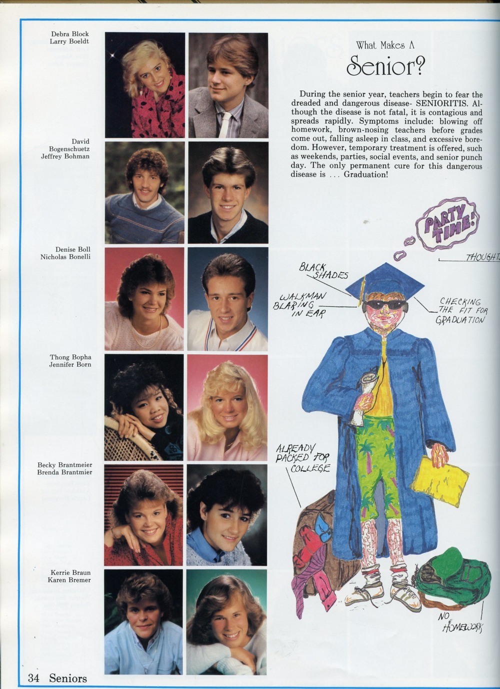 1987 Sheboygan North High School Yearbook Page 34: Debra Block, Larry Boeldt, David Bogenschutez, Jeffrey Bohman, Denise Boll, Nicholas Bonelli, Thong Bopha, Jennifer Born, Becky Brantmeier, Brenda Brantmeier, Kerrie Braun, Karen Bremer.