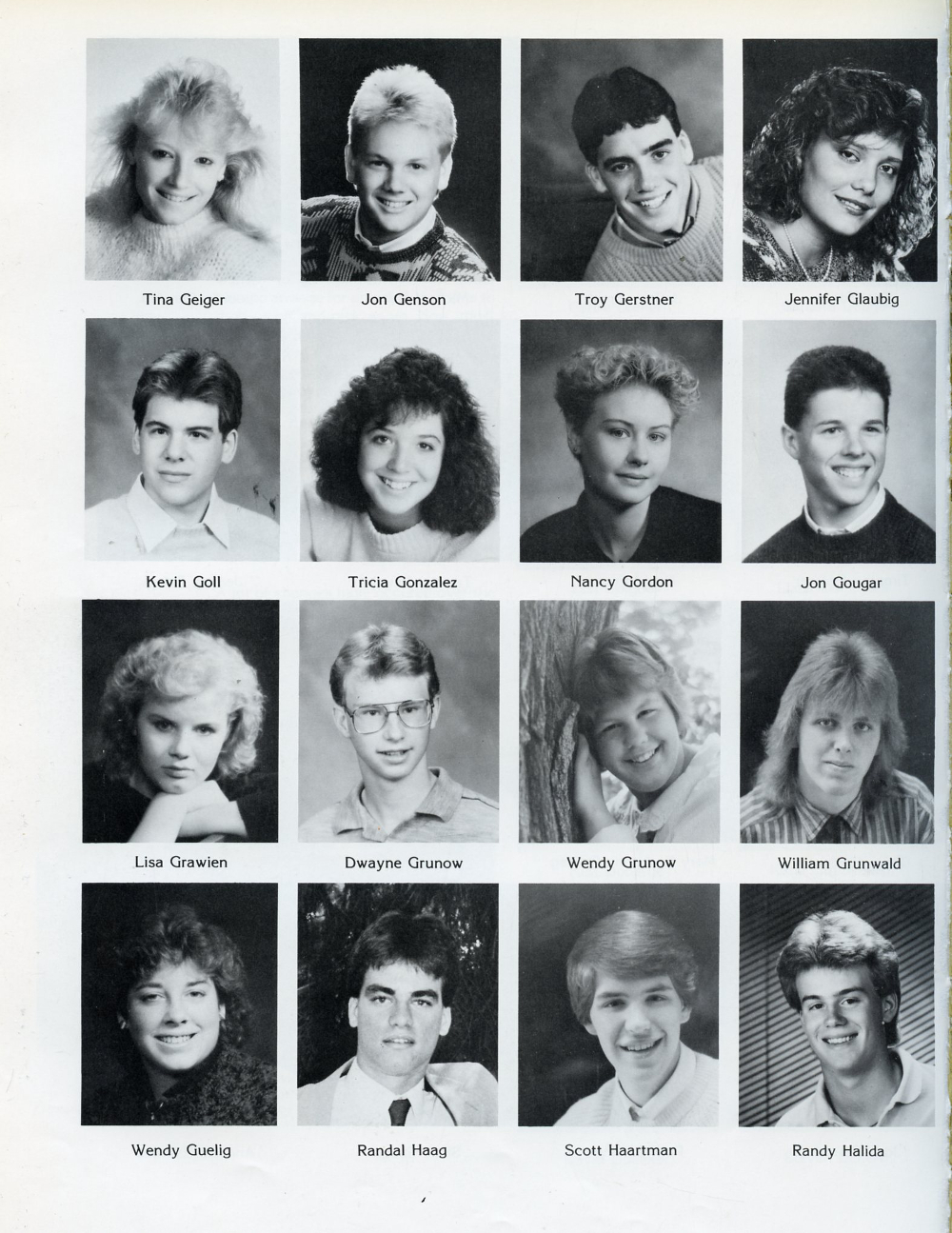 Lisa Grawien, Dwayne Grunow, Wendy Grunow, William Grunwald, Wendy Guelig, Randal Haag, Scott Haartman, Randy Halida.