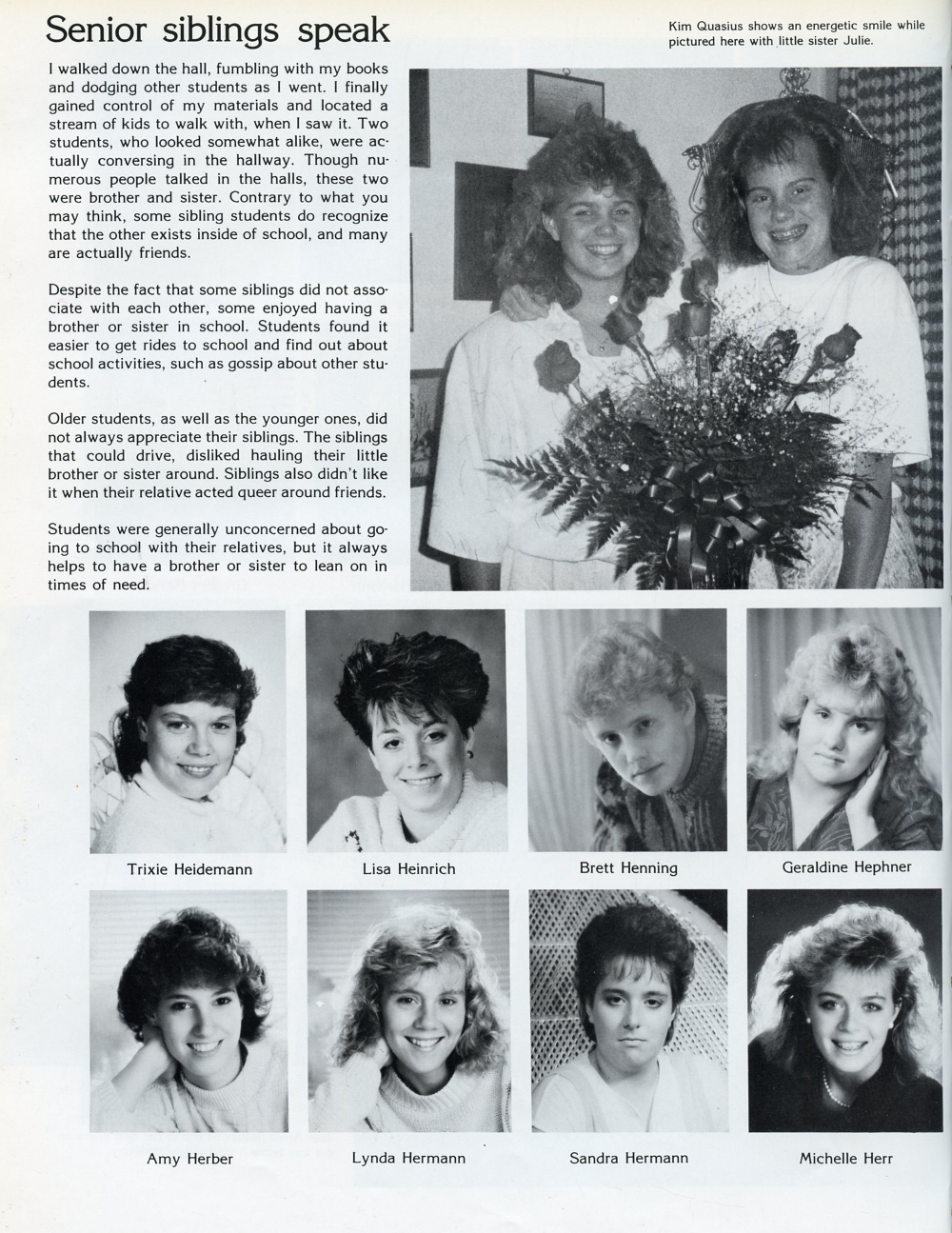 1988 Sheboygan South High School, Page 130: Trixie Heidemann, Lisa Heinrich, Brett Henning, Geraldine Hephner, Amy Herber, Lynda Hermann, Sandra Hermann, Michelle Herr.