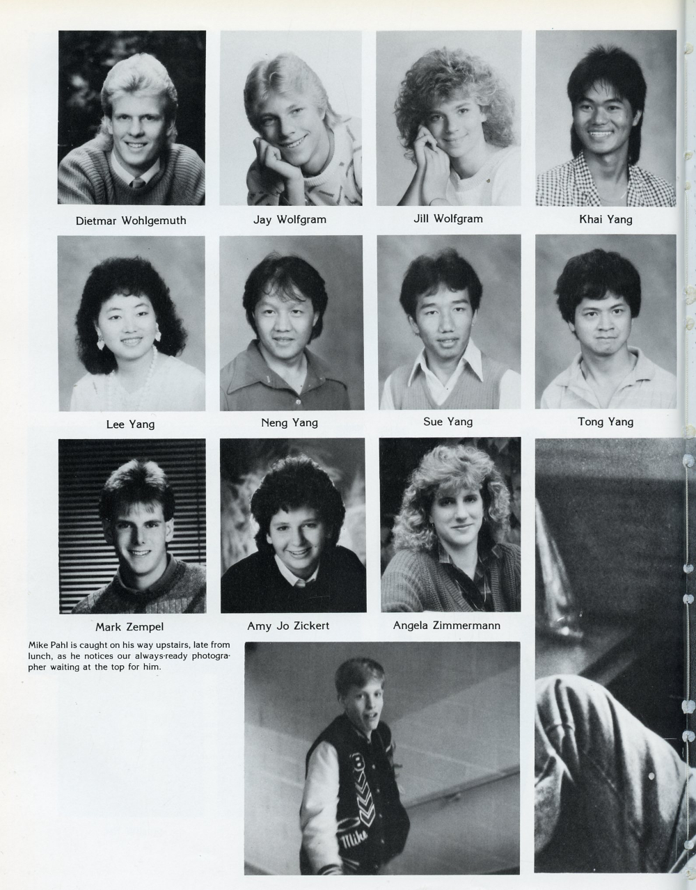 1988 Sheboygan South High School, Page 152: Dietmar Wohlgemuth, Jay Wolfgram, Jill Wolfgram, Khai Yang, Lee Yang, Neng Yang, Sue Yang, Tong Yang, Mark Zempel, Amy Jo Zickert, Angela Zimmermann.